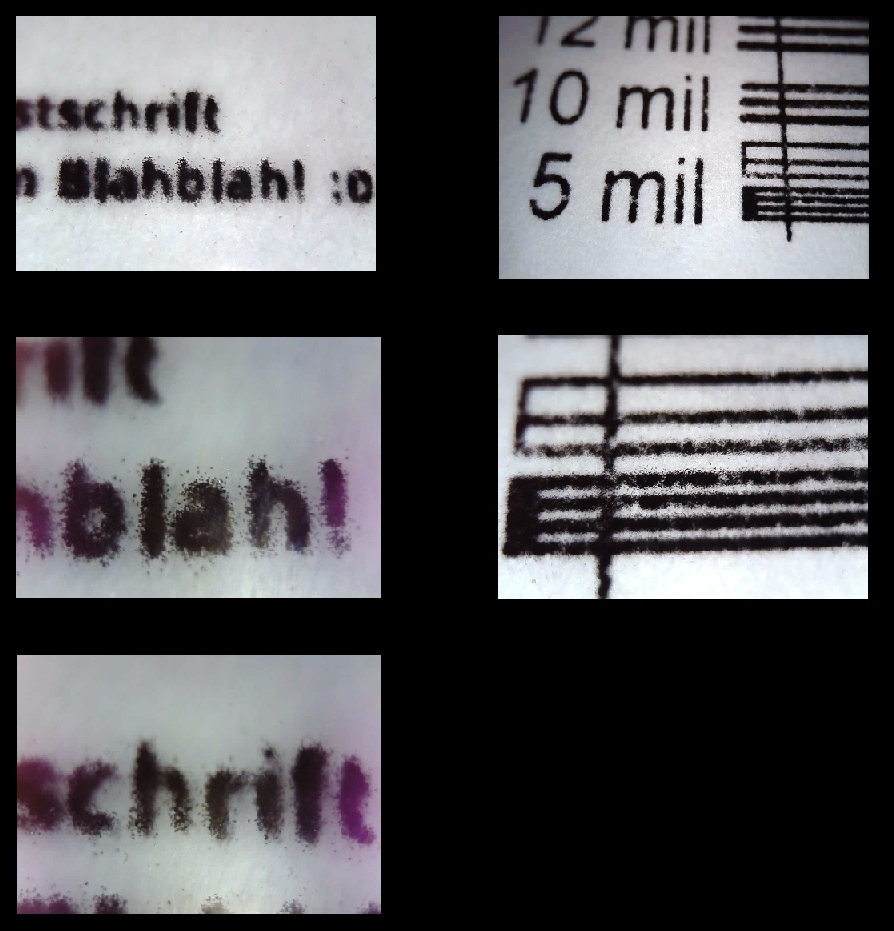 > "Nimmt man mal an, das sei die Höhe der Zeichen, > dann ergibt sich für etwa ein kleinen 'a', dass auf einem > Abstand von weniger als 0,1mm jeweils ein >Kupferstreifen und ein > weggeätzter Streifen kommen. Das sind (da das >kleine 'a' ja nur > etwa 2/3 der Gesamthöhe hat, weniger als 3,7mil." Das kleine a passt, vertikal oder auch horizontal, jeweils etwa 3 mal in einem Millimeter, somit ist es ca. 13mil / 330µm groß. Also doch noch relativ riesig :o) Nur die Strichbreite der Schrift dürfte etwa 100µm / 4mil betragen. Das Problem ist einfach der Drucker, dessen bin ich mir jetzt gewiss. 5mil-Linien scheint er zwar zu schaffen - aber wie man sieht, Toner und scharfe Ränder sind halt echt zwei verschiedene Welten... siehe Bilder (Schrift links ist zweilagig). Toner-Ränder sind halt nunmal per se IMMER unscharf und körnig (siehe Bild). Und das mag der Grund sein, weshalb gerade bei feinen Strukturen (dünne Linien nahe beieinander) die Ränder sehr schnell überbelichten und "ausfransen". Bei größeren Motiven fällt das halt nicht gleich so auf. Sagt mal - wenn tatsächlich der "Heimdrucker" das Ganze limitiert (trotz wie gesagt bereits doppelt-lagigem Motiv) - wie/wo kann man denn eigentlich gute Vorlagen professionell drucken lassen? Könnt Ihr mir da etwas empfehlen? Kann man auch einzelne Seiten einigermaßen preisgünstig drucken lassen, also ohne gleich eine Tausender-Auflage zu bestellen? :D Ich würde das gerne mal mit einem richtig guten, professionelles Druck-Motiv testen - mit saaattem Schwarz und schaaarfen Rändern! :o)