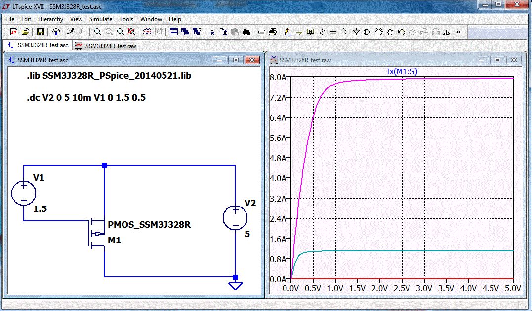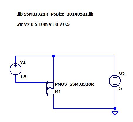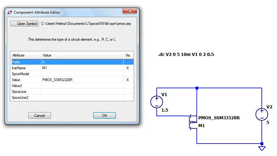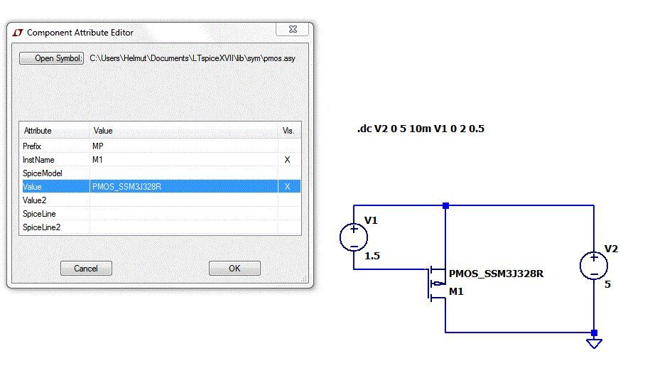 Die Datei mit dem Modell "SSM3J328R_PSpice_20140521.lib" in das Verzeichnis des Schaltplanes kopieren. Einen PMOS in den Schaltplan einfügen. CTRL-Rechtsklick auf das Symbol. Ein Dialogfenster erscheint. Prefix:MP durch Prefix:X ersetzen, da das Modell ein Subcircuit ist. Jetzt hast du ein Symbol für ein Subcircuit. X steht für Subcircuit. 1.GIG -> 2.GIF OK klicken Am Mosfet das PMOS durch den Names des Modells(Subcircuit-Name)erstzen - PMOS_SSM3J328R. 3.GIF Ich empfehle die Datei in das Verzeichnis des Schalplanes zu legen und jedem Design ein eigenes Verzeichnis zu spendieren. LTspice sucht auf jeden Fall auch im Verzeichnis des Schaltplanes nach der Datei die mit .lib oder .inc eingebunden wird. Die Datei mit einer SPICE-Directive einbinden. .lib SSM3J328R_PSpice_20140521.lib 4.GIF Save RUN 4.GIF Gruß Helmut .lib SSM3J328R_PSpice_20140521.lib