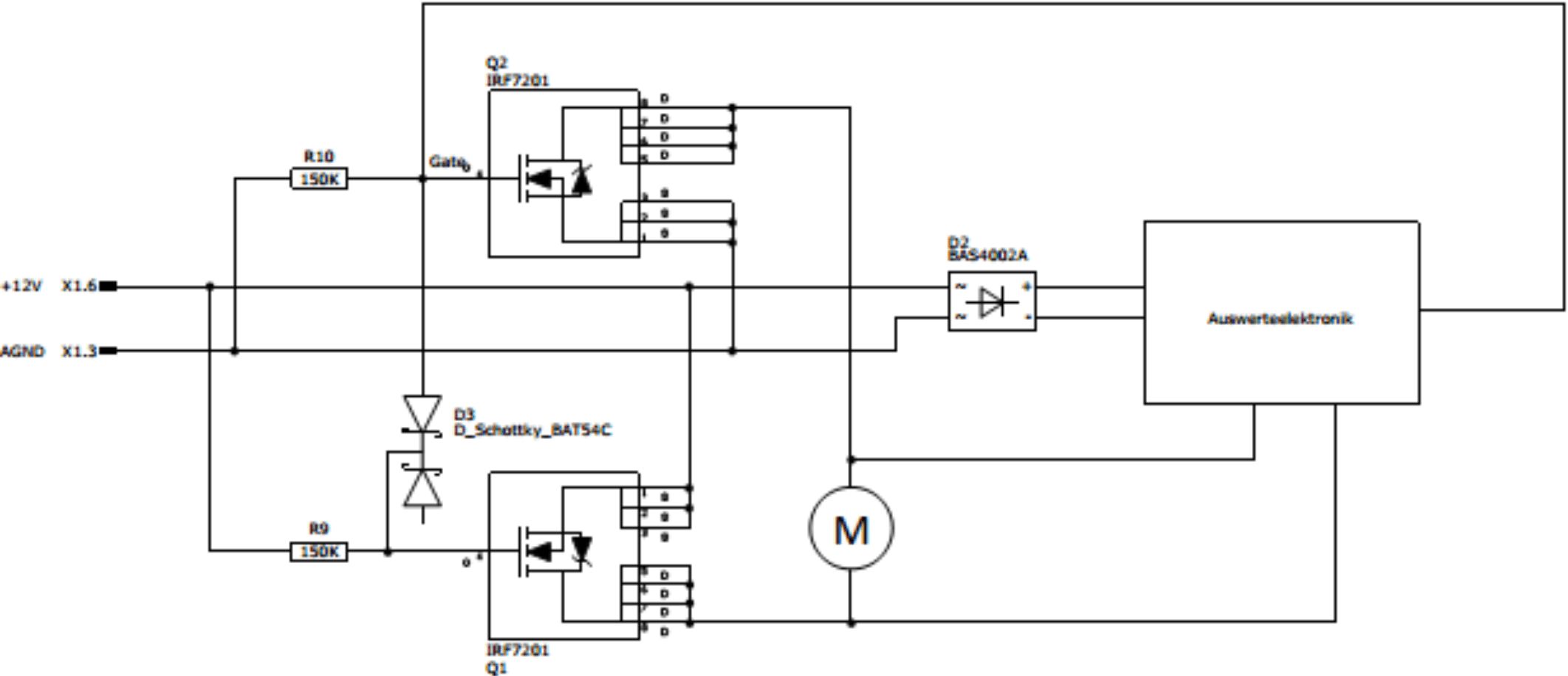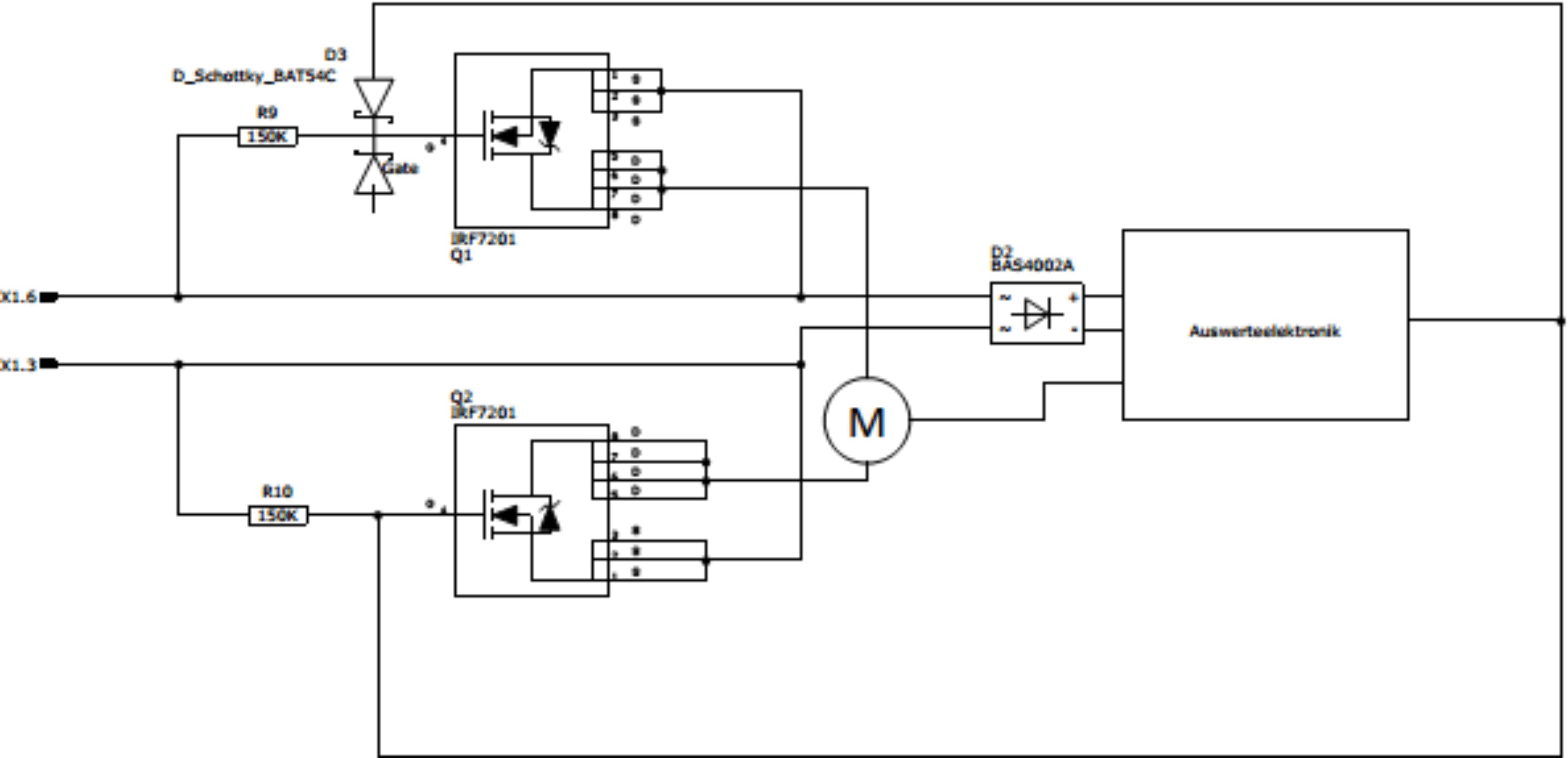 Ich weiß, wie man Schaltpläne "normalerweise" zeichnet, aber darauf kommt es hier doch nicht an. Ist eh nur ein vereinfachtes Schaltbild, bei dem bisschen was weggelassen wurde. Im Normalbetrieb liefert die Auswerteelektronik ein High, sprich 12V, an den Gates, welches die beiden MOSFET durchsteuert. Wenn der Motor abgeschaltet wird geht dieses Signal auf Low, d.h. 0V und die MOSFET sperren. Das Ganze soll auch funktionieren, wenn die Eingangsspannung vertauscht wird, deshalb auch der Brückengleichrichter für die Elektronik. Ich wollte aber eigentlich nur wissen, ob und wie man die MOSFET und evtl. den Gleichrichter für den EMV-Test, sprich gegen Überspannungsimpulse auf den Eingangsleitungen, schützen kann.