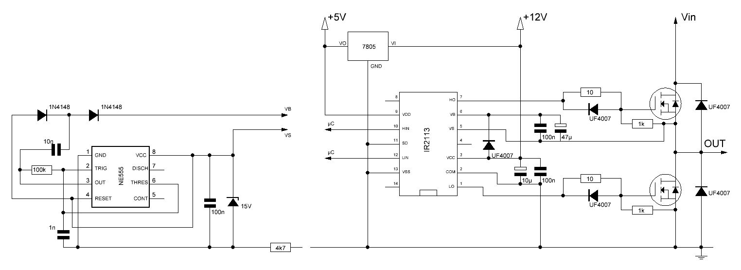 Hallo liebe Gemeinde, ich versuche mich gerade an einer Halbbrücke, basierend auf dem IR2113 und 2xIRZL44N. Die angehängte Schaltung entspricht weitgehend der aus dem Blog: http://tahmidmc.blogspot.de/2013/01/using-high-low-side-driver-ir2110-with.html und funktioniert auch solange die PWM-Frequenz hoch genug ist. Nun habe ich versucht die in der Application Note https://www.infineon.com/dgdl/an-978.pdf?fileId=5546d462533600a40153559f7cf21200 (Bild 16) erwähnte Ladungspumpe anzuschließen. Leider gelingt es mir nicht damit den high-side MOSFET dauerhaft anzuschalten. Nach wenigen Sekunden (ca. 3) schaltet er einfach ab. Der NE555 erzeugt bis dahin das erwartete Rechtecksignal. Die 3 Sekunden erreiche ich auch nur wenn ich den 1K-Widerstand zwischen Gate und Source weglasse, sonst geht es um einiges schneller. Die Ladungspumpe für sich alleine scheint auch zu funktionieren, wenn sie an eine normale Spannung (also ohne diese komische Versorgung aus 4,7kOhm + Zehnerdiode) angeschlossen ist. Hat das irgendjemand schon einmal erfolgreich versucht? Sind die 1K-Widerstände zwischen Gate und Source wie im genannten Blog empfohlen tatsächlich sinnvoll? Vielleicht hat ja jemand eine Idee. Danke schon mal für's Lesen bis hierher.