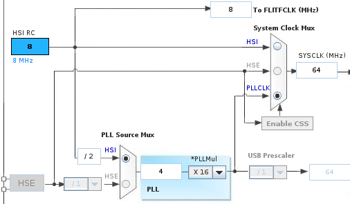 Ich weiß nicht ob man die PLL mit HSI schneller einstellen kann aber ich bin mir ziemlich sicher, dass im RefMan im RCC-Kapitel bei der PLL etwas von 64MHz Maximum steht. Ohne HSE macht der F103 für mich aber auch nur begrenzt Sinn und die paar Bauteile und zwei Pins sollte man noch irgendwie übrig haben.