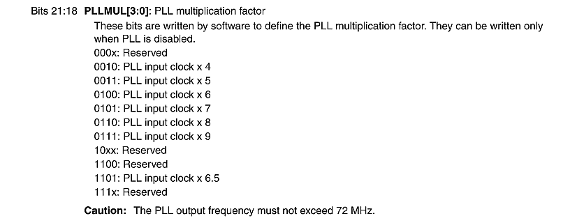 Stefan U. schrieb: > 8Mhz / 2 * 16 16 ist kein gültiger Wert für PLLMUL (siehe RM0008, Seite 132). Erlaubt ist maximal ein Faktor von 9, womit mit dem HSI maximal 4*9 = 32 Mhz möglich sind. Die maximalen 72 MHz sind nur mit dem HSE und z.B. einem 8 MHz Quarz/Resonator erreichbar.