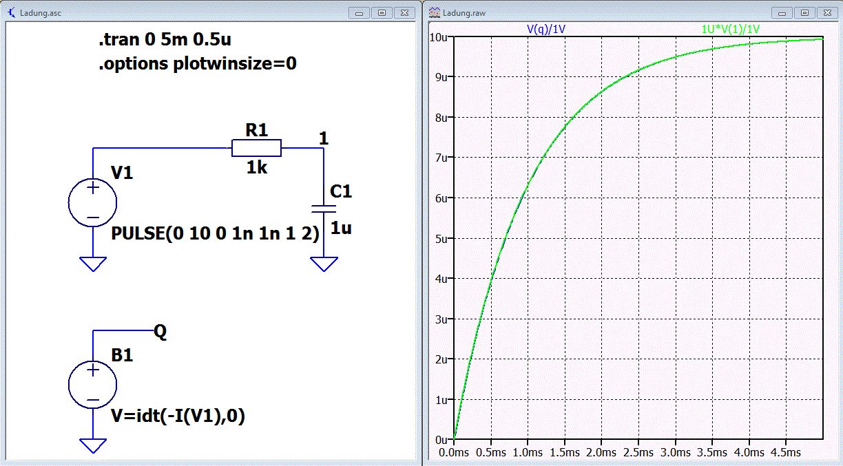 Bei einem Kondensator dessen Kapazität nicht von der Spannung abhängt gilt für die Ladung Q(t) = U(t)*C = Integral I(t)dt 0 bis t Im Anhang ein Beispiel. Falls die Kapazität des Kondensators von der Spannung abhängt, glit nur noch Q(t) = Integral I(t)dt 0 bis t Dazu benötigt man einen Integrator in der Simulation da LTspice kein Integral im Plotfenster berechnen kann. Siehe Schaltung im Anhang.