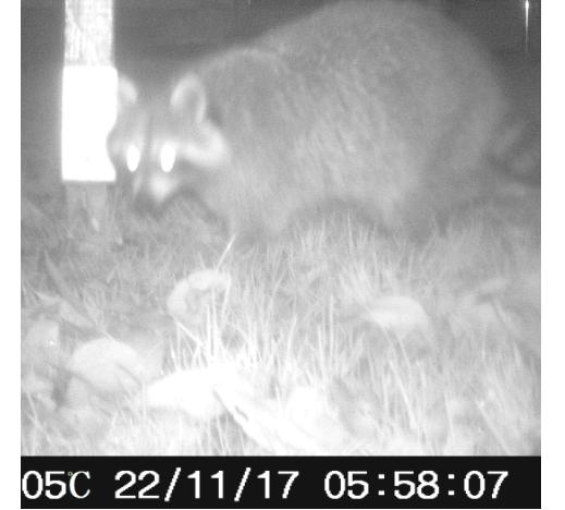 So einen Waschbär habe ich kürzlich auch mit der Wildkamera erwischt. LEDs mit 940 bzw. 950 nm sind da auch eingebaut. Die sieht man nur, wenn das Auge eine Weile an Dunkelheit gewöhnt ist. Der Unterschied zu 850nm ist sehr deutlich. Was ich gerne mal wüsste: Ist das rötliche Glimmen eine spektrale Unreinheit der LEDs, oder ist das menschliche Auge in dem Bereich noch etwas aufnahmefähig?