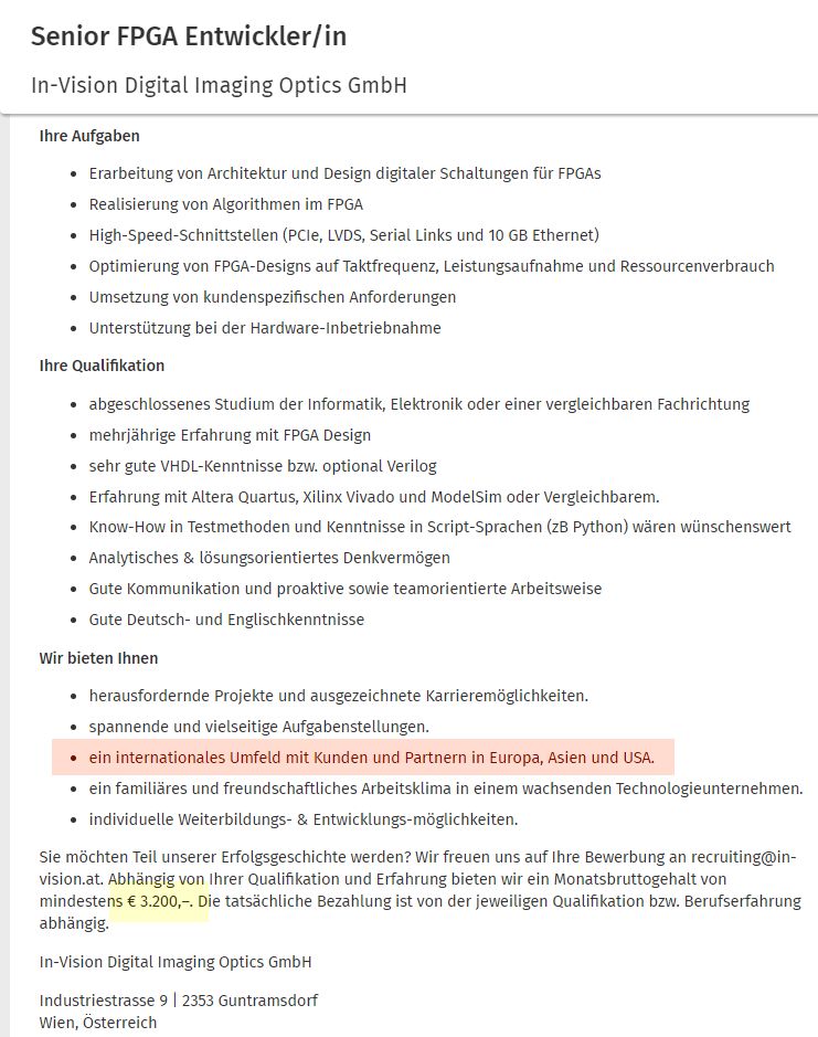 Die Gehälter in Österreich sind unterirdisch! Absolut kaputter Markt. Komplett von Zeitarbeit durchsetzt und in Sachen Gehältern stark stagnierend. Als Beispiel das hier: https://www.xing.com/jobs/guntramsdorf-senior-fpga-entwickler-35911287?paging_context=search&search_query%5Bkeywords%5D=fpga&search_query%5Blimit%5D=20&search_query%5Boffset%5D=140&ijt=jb_18 Gesucht wird ein erfahrener Entwickler, der auch noch mit Asien und anderen Abteilungen zusammenarbeiten soll (und deshalb sprachlich fit sein muss). Das Ganze für 3800,- x 14 (ausgehandelt nach Rückfrage bei der Abteilung). Und obendrein in Wien, wo die Mieten über alle Grenzen wachsen. In Deutschland gibt es 5500 x 13.x. Das muss mal gesagt werden.