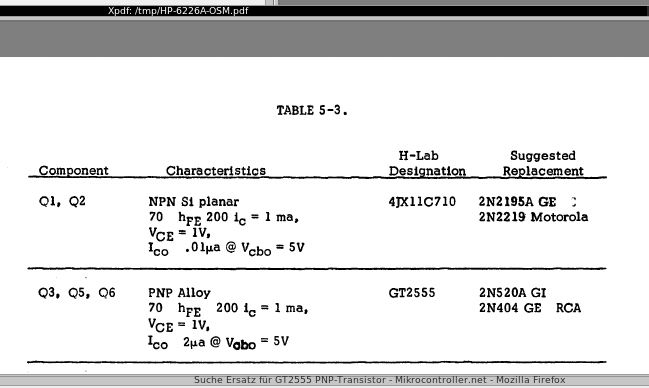 Patrick S. schrieb: > Letztentlich sind bei dem HP einige der GT2555 gestorben, die HP-6226A Bj.1962 sugested repl. 2N520A GI oder 2N404 GE oder RCA Daten zu diesen werden sich auftreiben lassen