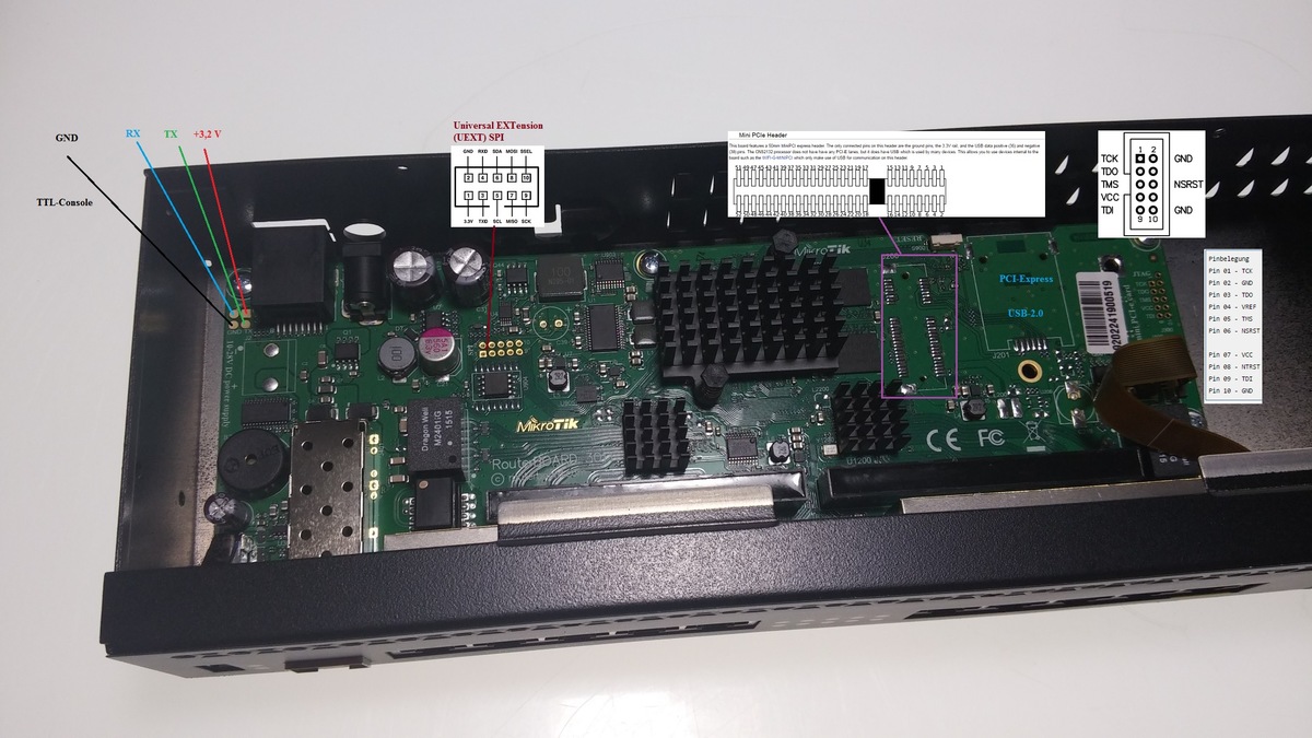 Also, wie der Threadname schon indiziert geht es um die Frage der erweiterbarkeit des Mikrotik Routerboards RB3011UiAS-RM, um genau zu sein. Es ist so, bei der Einführung des 3011er war auch ein Desktop Version geplant - RB3011UiAS-2HnD-IN - intern gleiche Platine, erweitert um einen pci-e slot für ne wlan karte. (siehe Seite57 - "https://www.balticnetworks.com/docs/2016-Q1Q2.pdf") Mittlerweile scheint es allerdigs so als ob diese Version nie mehr in den Verkauf gelangen wird und alles was man im weiten Netz so findet sind ein Paar Präsentationsfotos vom Vorführgerät. Und hier daheim weint ein armes Routerboard dass sich so gerne eine Fallback-LTE-Leitung zu Weinachten wünscht... LTE insofern, da es für mich so aussieht also ob auf der Platine nicht nur Platz für ein pci-e karte ist sondern ebenfalls für einen SIM-slot wäre. ...und jetzt langer Rede kurzer Sinn, das Anlöten der beiden Slots ist ja nicht das Problem, allerdigs nun die Frage mit was bestück ich die restlichen freien Platinenplätze wie im Präsentationsfoto zu sehen. Handelt sich ja eigentlich bloß um ein paar Elemente ;P - soll ich von den restlich Verbauten Elementen Rückschlüsse darauf beziehen - aller gleicher Elko wie links oben auf der Platine, Widerstände ausmessen aller Farbäquivalenz, Transistoren ?? vergleichen und beten...? Wie würdet Ihr vorgehen, abseits der klar einfachsten Lösung einfach extern anstecken (perLAN/USB - schon klar)oder intern USB erweitern - nein all diese Vorschläge bitte nicht - rein der Platienerweiterungsgedanke bitte. Vielleicht gibt es auch eine Art standart Treiberschaltung für die pci-e Ansteuerung and der ich mich orientieren kann. Jeder produktive Input ist gerne gefragt - und sorry wegen den Ausschweifungen - Donk-sche Source und Links: https://mstream.com.ua/mikrotik-mum-praga-2015.html https://www.lteforum.at/mobilfunk/projekt-mikrotik-rb922uags-5hpacd-sierra-mc7455.5438/ https://asp24.ru/obzory/obzor-marshrutizatora-mikrotik-rb3011uias-rm/ https://mobilarena.hu/tema/mikrotik_routert_hasznal_valaki/hsz_451-500.html