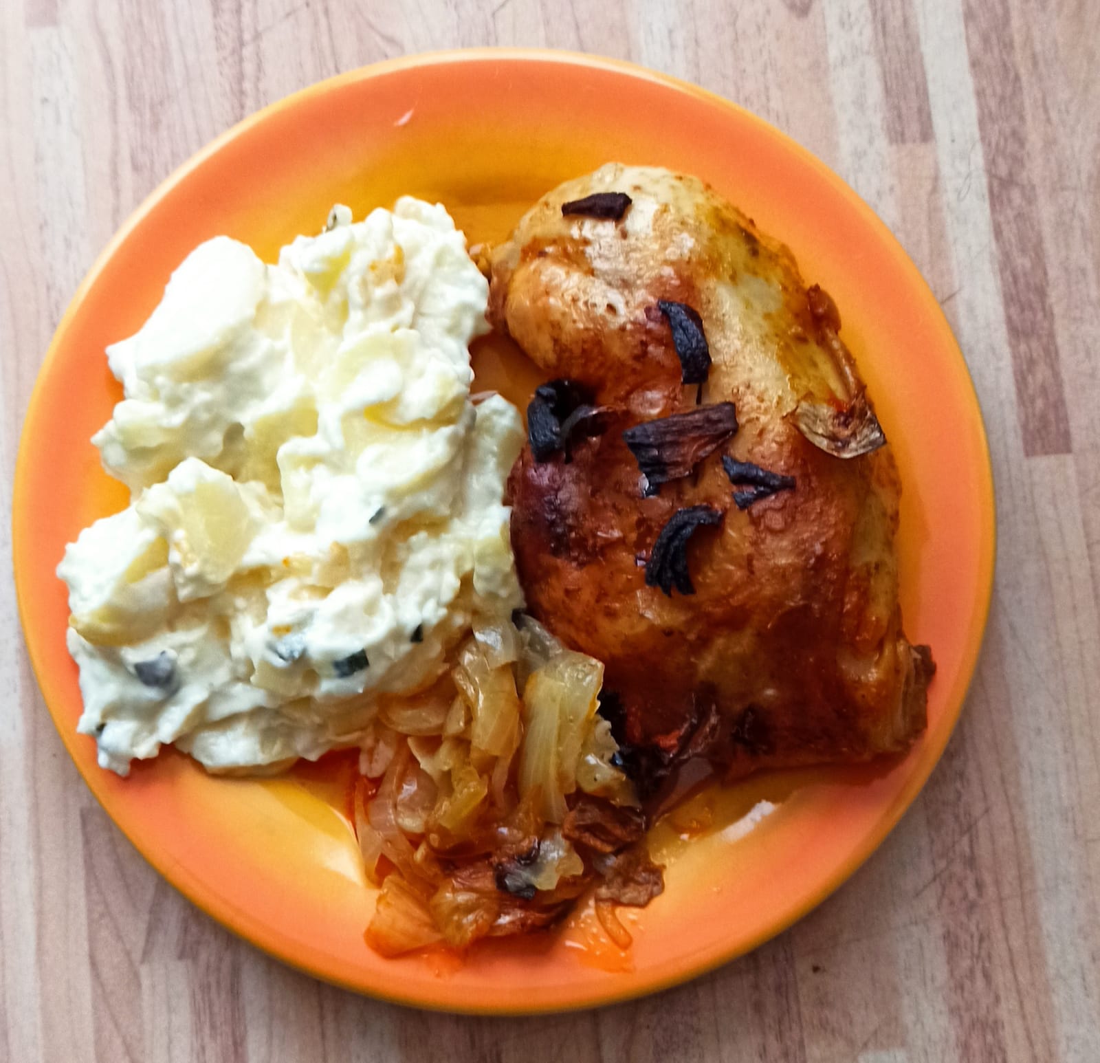 Heute handgestricktes Mittagessen, Hähnchenkeulen im Minibackofen mit viel Zwiebeln und Knoblauch. Kartoffelsalat von Aldi. Leider hatte ich kein Rotkraut zur Hand, aber es geht auch so. MfG ein alter knacker