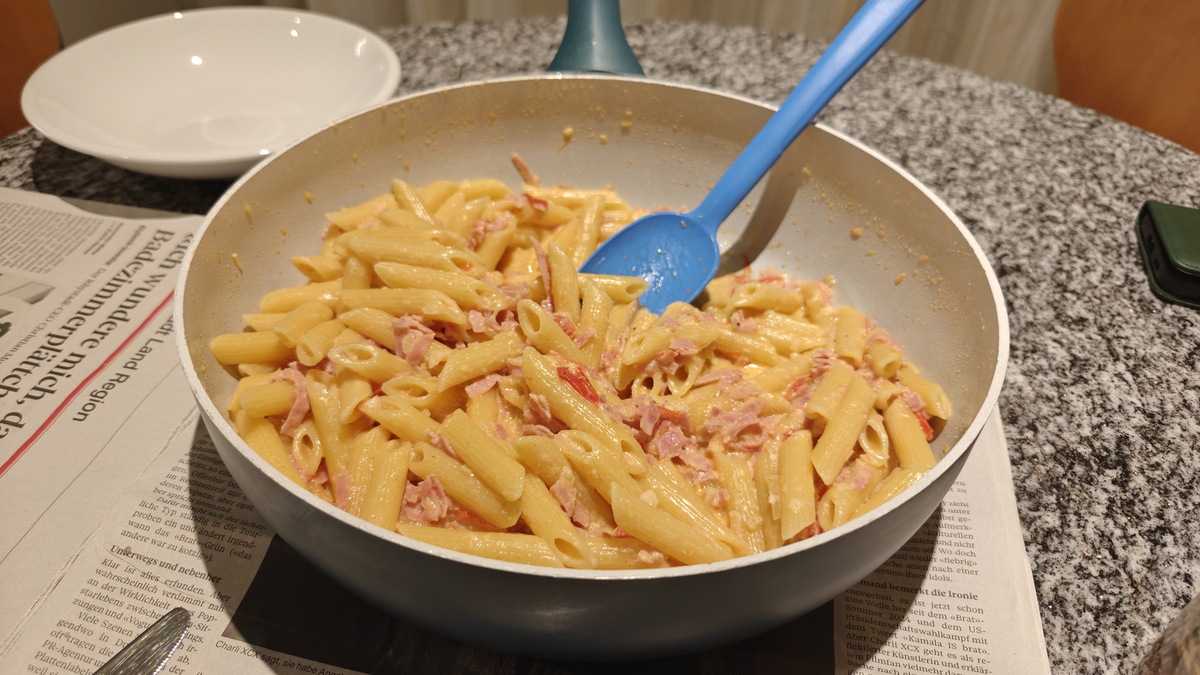 Penne, Rahm & Milch, Parmesan, Knoblauch & Zwiebeln, Schinken. (Und eine Tomate ist auch drinn)