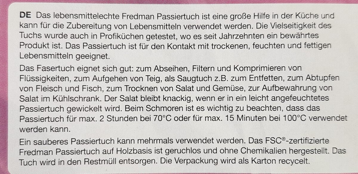 Michael M. schrieb: > Für diese Anwendung gibt es bei Rossmann sogenannte Passiertücher. Wir > verwenden sie, um in der Heißluftfritteuse Reibeplätzchen zuzubereiten. "Das Tuch wird in den Restmüll entsorgen". Irgendwie habe ich den Vater von Tutty Tran im Ohr: "Du kein deu mehr?" :-)