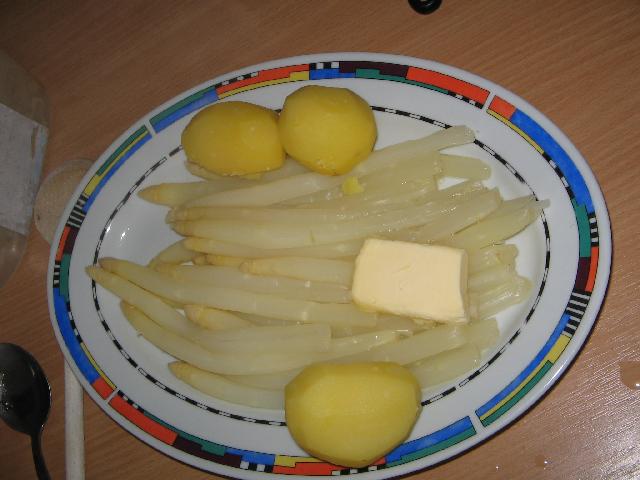 Moin, Was man auf dem Bild vielleicht nicht so gut erkennen kann: Ein paar Scheibchen vom gesottenen Schweinspoppes, die gab's auch noch dazu. Nee, Diaet mach' ich keine. Der Spargel lag' grad so bei Feinkost Albrecht rum, und vor allem wurde der noch durch 2 Gummibaender zusammengehalten - und da ist mir gerade so ein aehnliches zerbroeselt, was natuerlich ein Riesenkaufargument war... Gruss WK