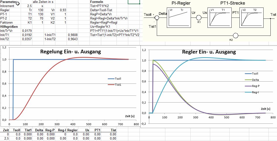 Zu dem Thema PT2-Strecke identifizieren hatte ich bisher nur das Prinzip an reinen PT2-Gliedern getestet. Dein praktisches Beispiel habe ich mal genutzt, um mein Handwerkszeug (Excel-Tabelle) zu optimieren. Denn in der Praxis kommen dann immer ein paar Problemchen - so wie hier: 1. die Kurve ist kein reines PT2-Glied 2. die Zeitkonstanten liegen sehr dicht zusammen 3. der Endwert ist nicht bekannt Das führt dazu, dass die PT1-Kurve für T1 nicht soweit verschoben werden kann, dass das T2-Glied kaum noch Einfluss hat. D.h. man findet durch Verschieben nur die Größenordnung von T1. Man muss also an allen 3 Parametern (T1, T2, Endwert) drehen, bis die simulierte PT2-Kurve mit der Messkurve zur Deckung kommt. So habe ich aus deiner Messkurve T1=130s, T2=70s und Endwert 42,7° herausbekommen. Im Bild sieht man: - oben die Parameter, an denen gespiel wird - links die gemessene Kurve - in der Mitte die grüne Messkurve, die rote PT1-Kurve mit T1 und die orange verschobene PT1-Kurve. Wie man sieht, trifft sie nicht besonders gut aus o.a. Gründen. - rechts sieht man das Ergebnis. Das simulierte PT2-Glied trifft die Messkurve recht gut - völlig ausreichend, um damit den Regler zu berechnen. Ganz unten ist noch der Anfang der Tabelle für die Simulation mit den benutzten Formel zu sehen. Das hilft dir wahrscheinlich nicht viel weiter, aber da ich es schon mal gemacht habe, wollte ich es nicht vorenthalten.