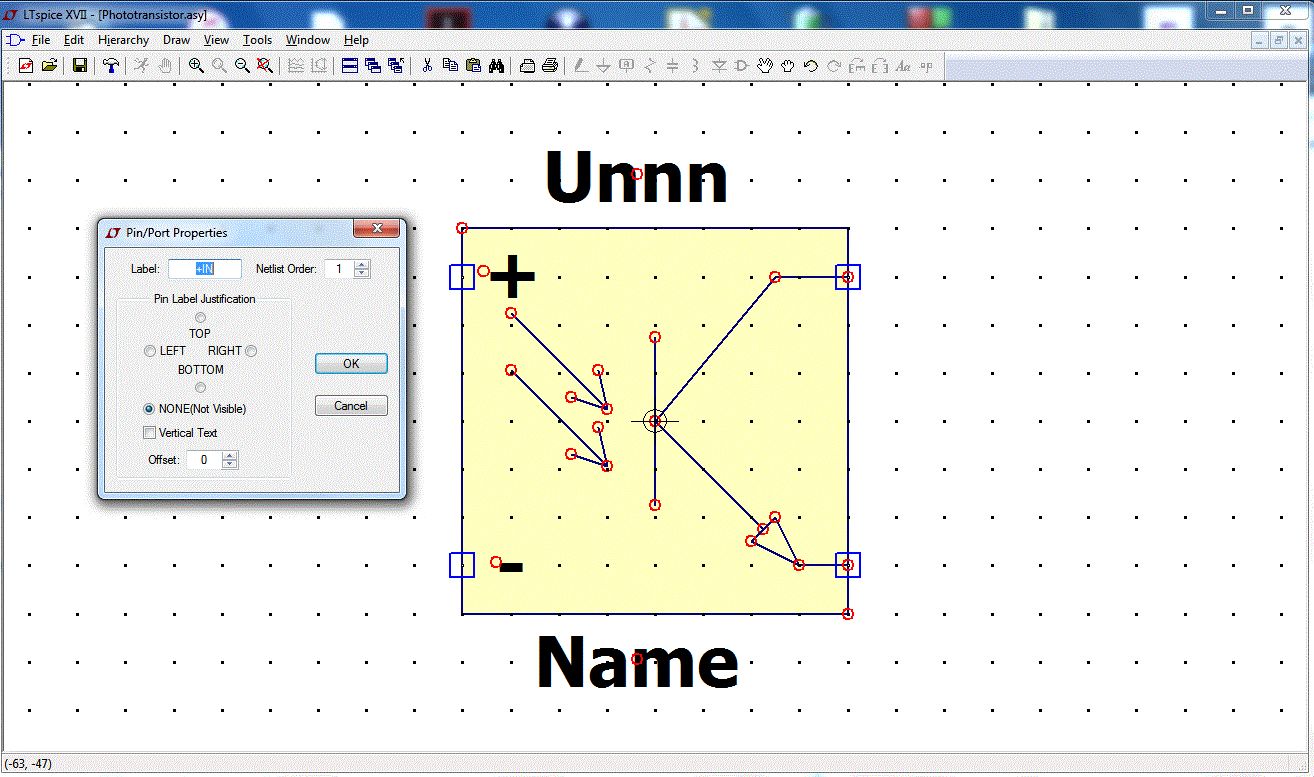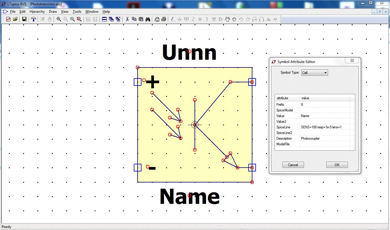Hallo Markus, du benötigts ein Symbol mit 4 Pins. Die Netlist-Order der Pins muss mit der Reihenfolge der Pins in ".subckt pin1 pin2 pin3 pin4 ...." übereinstimmen. Siehe 1. Bild vom Symbol-Editor. .subckt Name Opt_In+ Opt_In- Coll Emit Außerdem muss man noch die allgemeinen Attribute des Symbols setzen. Siehe 2. Bild. Einfach alle meine Dateien in ein beliebiges Verzeichnis legen. Auf keinen Fall im Pfad C:\Program .... Ich habe als Kommentar 1mV je mW/cm^2 als Kommentar geschrieben. Ob das passt weiß ich nicht. Zeig mal einen Link auf das Datenblatt. Gruß Helmut Nachtrag: Ich habe das aktuelle LTspiceXVII verwendet. http://ltspice.linear-tech.com/software/LTspiceXVII.exe