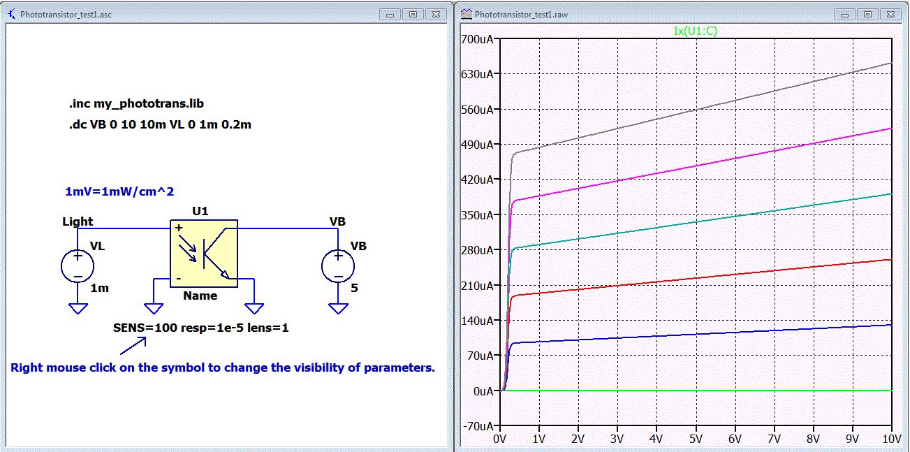 Noch ein Tipp: Das Symbol "Phototransistor.asy" passt für alle Phototransistoren die ein Subcircuit mit der "Pin"-Reihenfolge +Eingang -Eingang Collecor Emitter haben. .subckt Name Opt_In+ Opt_In- Coll Emit .... Im Schaltplan dann "Name" durch den Namen des subcircuits ersetzen und mit der passenden ".lib filename" die Modelldatei angeben.