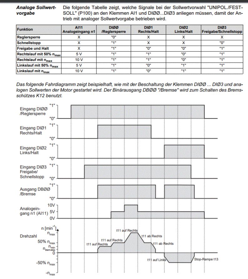 @ Georg - Brücke für Bezugspotential ist drin - hab ich mal Testhalber raus genommen und dann hatte auch DI00 (Reglersperre) nicht mehr funktioniert @Gerald - Hab das Ding zwischenzeitlich auch schon auf Werkseinstellung zurückgesetzt - hat leider nichts geholfen @ Claus - ja, die Richtung ist ausgewählt - hab nen Schalter dran - r=0 / l =1 und umgekehrt - ändert nichts an der Freigabe ich häng mal noch das Datenblatt an