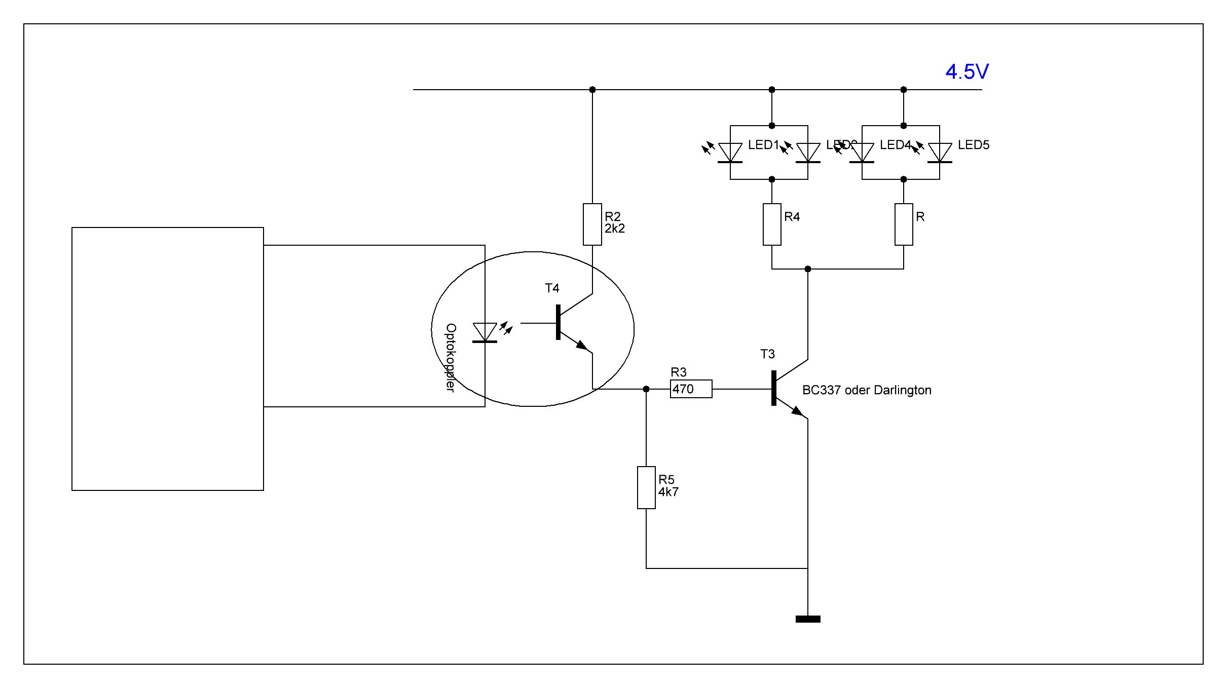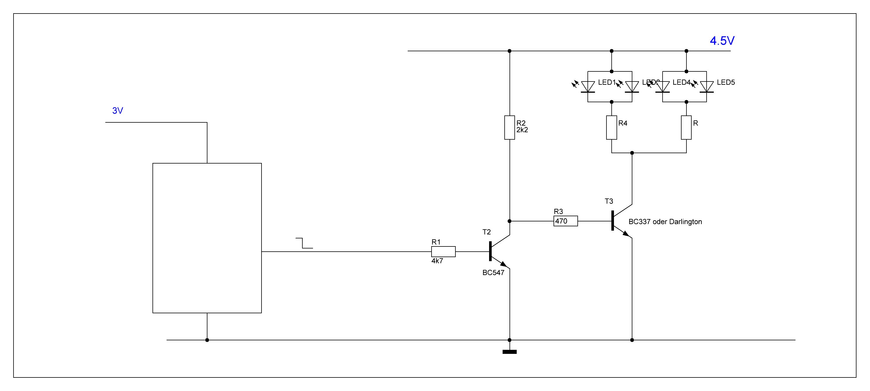 Also ich habe jetzt nochmal gemessen: Wird die Steuerplatine und die Fernbedienung eingeschalten, habe ich auf einem Draht welcher ursprünglich an der LED angeschlossen war konstant 2,9V DC. Erst wenn ich jetzt auf der Fernbedienung die Taste für das Licht betätige, wird auf dem anderen Draht welcher ebenfalls an der LED angeschlossen war der GND geschaltet ---> es wird ganz sicher der GND über die Platine geschaltet, wenn dann also die Schaltung wie ich sie vorhin hochgeladen habe so funktioniert (Basis des PNP Transistor an den geschalteten GND der Steuerplatine) dann werde ich alles so aufbauen. Sollten die LED nicht zu 100% abgeschaltet werden und immer nachdem ausschalten noch leicht leuchten, werde ich noch den 10k Ohm Widerstand von der Basis des Transistor auf die Vcc 4,5V des Akku legen. Nur um sicher zu gehen hier nochmal die neue Schaltung, mit der Frage ob es diese ist wo funktioniert.