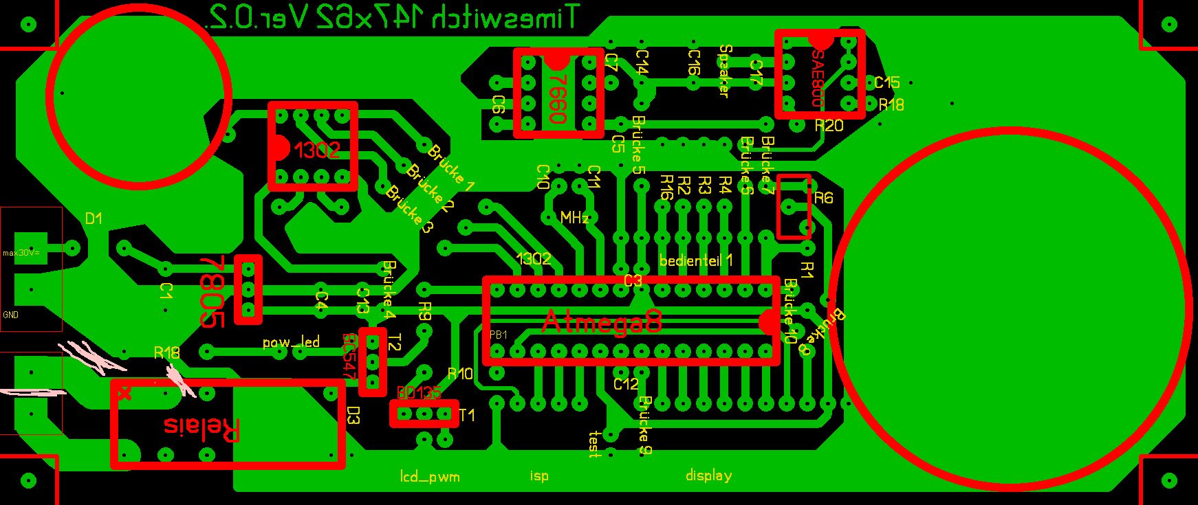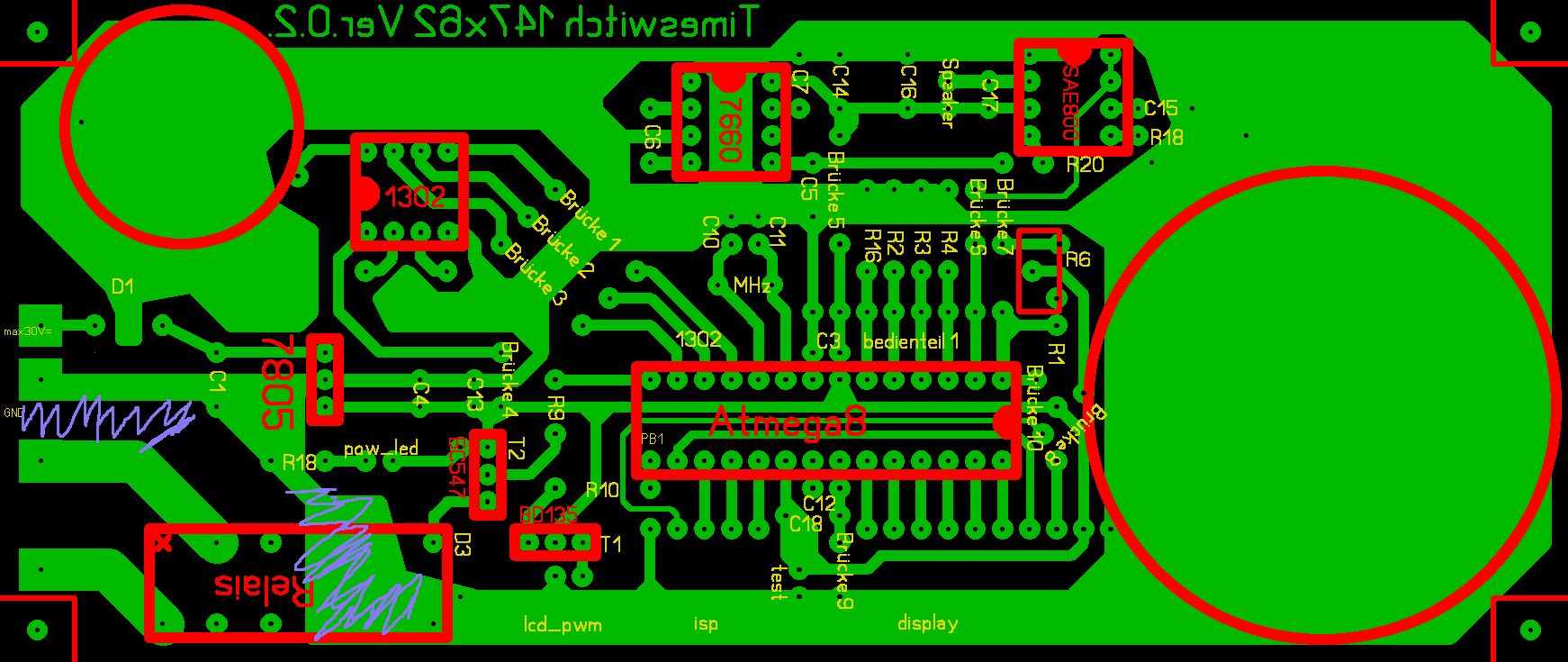 @ Jens Neumann (midibrain) >nun sind die Kriechwege an den Relaisanschlüssen geändert Ja. > und der >Abstand zwischen den Leiterbahnen wohl groß genug (?). Nein. Die nicht angeschlossenen Öffnerkontakte stehen auch unter Netzspannung, wenn das Relais nicht angezogen ist. Zwischen dem oberen Netzanschluß und GND sind es keine 5mm Kriechweg! Warum muss man bei einem Relais, das nun WIRKLICh viel Abstand zwischen den Steueranschlüssen und den Schaltkontakten hat, krampfhaft den Abstand vermindern? Die dämliche Massefläche hat dort rein gar nichts zu suchen! Wozu die krampfhafte Masseverbindung zwischen R18 und dem Relais? Die Massefläch kann das auch oben herum kontaktieren. Siehe Anhang.