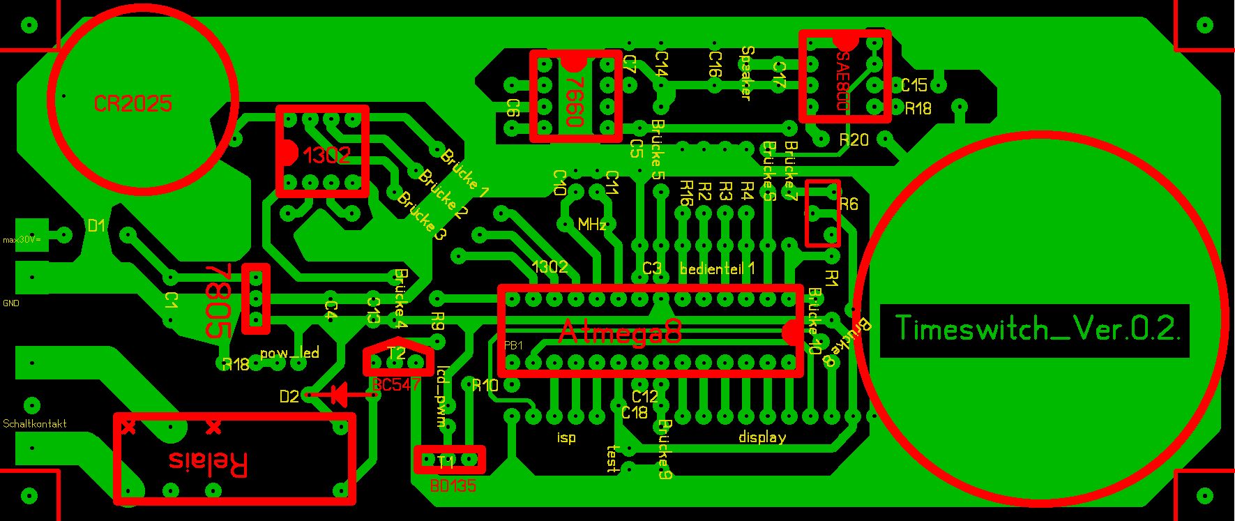 Hallo Joachim, da ich selbs ätze habe ich die Leiterbahnen recht breit gewählt. Da ich auch selbst bohren muss haben die Lötaugen nur 0,6mm Durchmesser. Das führt den Bohrer beim zielen und beim ansetzen auf der Platine besser. Die Bohrungen haben dann 0,8 b.z.w. 1,0 mm Durchmesser. Hab die Leiterbahnen zum Relais jetzt auf 4mm Breite geändert. Das müsste doch genügen? Jens
