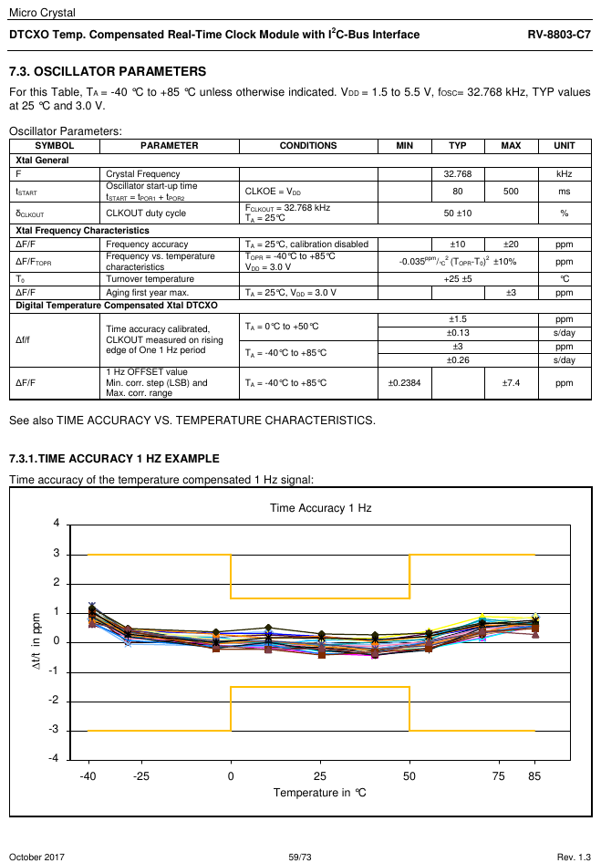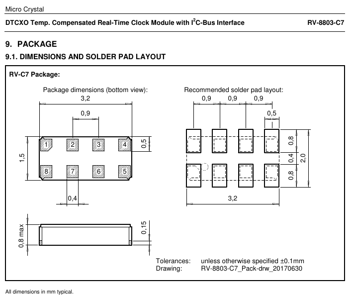 Mahlzeit! Der RV-8803-C7 wäre ja der ultimative RTC-Baustein (genau, sparsam, preiswert und klein), wenn... * ...man ihn löten könnte. Die Pads sind zwar größer als 0.4mm aber komplett versteckt (siehe Bild). Könnte man den kleben statt löten? Evt. sogar mit diesem Leitsilber? https://www.reichelt.de/Aetzmittel-Entwickler/LEITSILBER/3/index.html?ACTION=3&GROUPID=7788&ARTICLE=10256&SEARCH=leit&START=0&OFFSET=16& * ...er wirklich doppelt so gut kompensiert ist wie alle anderen TCXO-RTCs. Das Datenblatt hat zwei weiße Flecken an den entscheidenden Stellen. Einmal fehlt die Spannungsabhängigkeit der Frequenz, na gut, das wäre mir jetzt egal. Aber die gelben Linien im Bild sagen eindeutig max. 1.5/3ppm, leider sagt die Tabelle, tja, was? "Min.=Typ.=Max.=1.5ppm" kann ja wohl nicht gemeint sein, also fehlt der Max.-Wert. In der Übersicht auf der Webseite sieht es wieder so aus, als ob er besser wäre als der Rest; beim RV-3029 stehen die Max.-Werte: http://www.microcrystal.com/index.php/products/real-time-clocks Laut Werbung wäre es doch eine Mogelpackung, weil da immer die typischen Werte angegeben werden, also wäre 1.5ppm der typische Wert und maximal darf er liefern was er will. Unter den Umständen will das Teil niemand haben und dafür spricht auch, dass ihn nach 3 Jahren immer noch niemand außer Mouser verkaufen will.