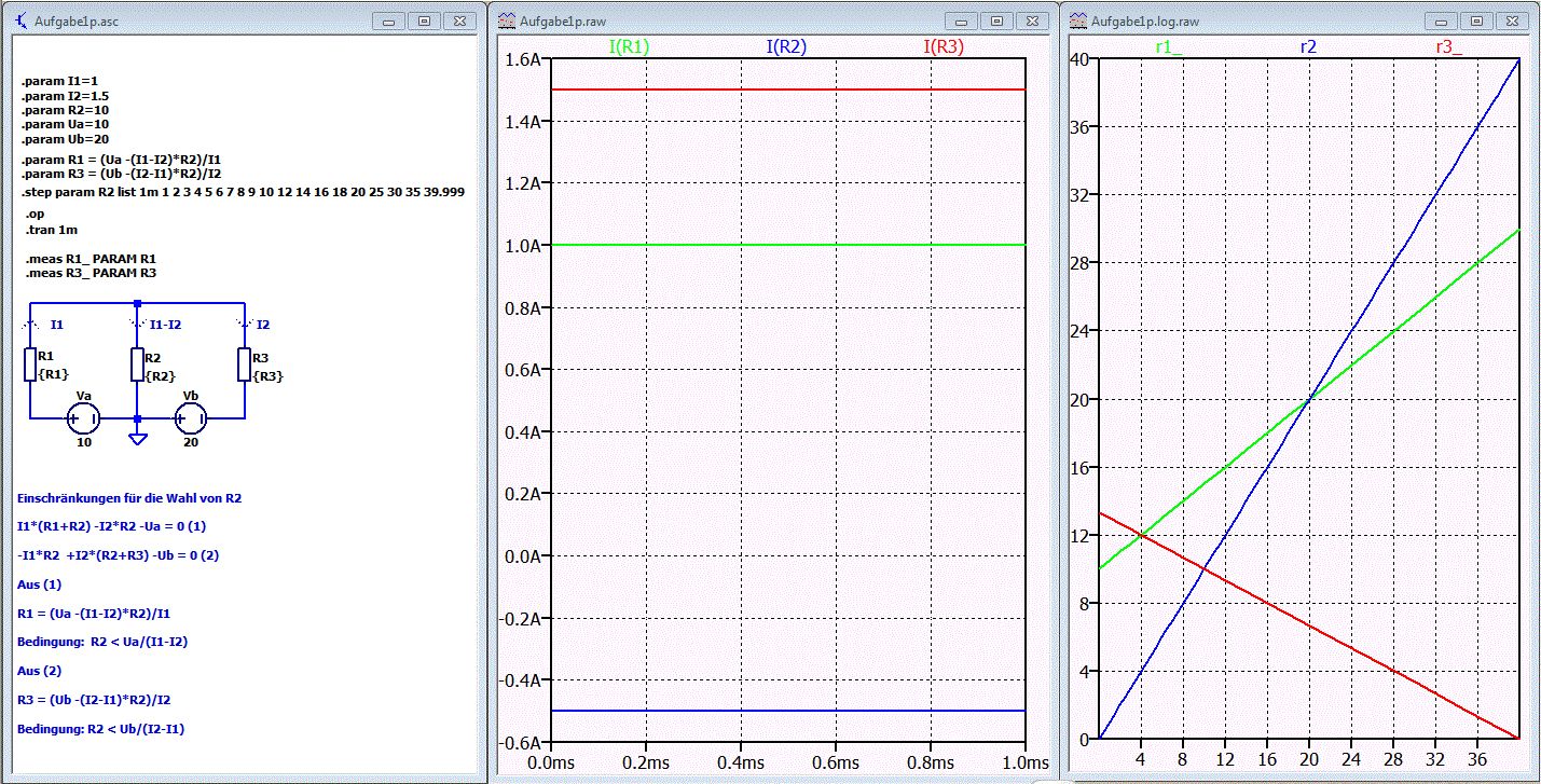 Nachtrag: Einschränkungen für die Wahl von R2 I1*(R1+R2) -I2*R2 -Ua = 0 (1) -I1*R2 +I2*(R2+R3) -Ub = 0 (2) Aus (1) R1 = (Ua -(I1-I2)*R2)/I1 Bedingung: R2 < Ua/(I1-I2) Aus (2) R3 = (Ub -(I2-I1)*R2)/I2 Bedingung: R2 < Ub/(I2-I1)