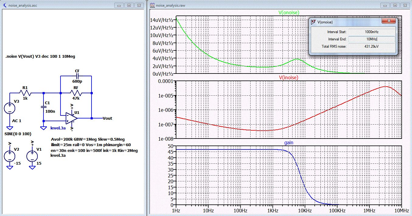 Ich habe die Opamp-Parameter noch etwas erweitert. enk Knickfrequenz für 1/f Verhalten von en ink Knickfrequenz für 1/f Verhalten von in Phase margin auf 60° gestellt Opamp model von level.2 auf level.3a umgestellt Mehr Punkte (100) je Dekade .noise V(Vout) V3 dec 100 1 10Meg Plot: V(onoise) Rauschspannung am Augang V(inoise) ist einfach V(onoise)/gain gain ist der AC-gain Gesamtrauschen V(onoise) 431,29uV (1Hz bis 10MHz)