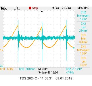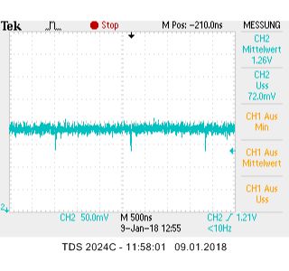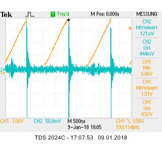 > Ich habe den Massepin vom OP gemessen Kann sein, dass da wegen schlechtem Schaltungsdesign nicht wirklich GND Potential vorhanden ist. Es kann aber ebenso sein, dass die Zuleitung der Masse-Klemme an deinem Tastkopf ein Magnetfeld empfängt, welches sich zur tatsächlichen Spannung addiert. Das war bei mir jedenfalls am Häufigsten die Ursache, für solche unerwarteten Peaks in der Messung. Abhilfe schafft die Nutzung einer sehr viel kürzeren Massefeder, da geht aber nur, wenn die Platine dafür entsprechende Anschlusspunkte hat. Hier ist der Effekt erklärt. http://www.all-electronics.de/richtiges-testen-von-stromversorgungen-teil-2/ Wenn das mit der Feder mechanisch nicht geht, hilft es manchmal auch, ein richtig dickes Kabel von der GND Buchse des Oszilloskopes zur GND Fläche der Platine zu verlegen, mit möglichst niederohmigem Anschluss (ich löte es immer an die Platine an). Das führt zwar nicht zu perfekten Ergebnissen, aber immerhin besseren.