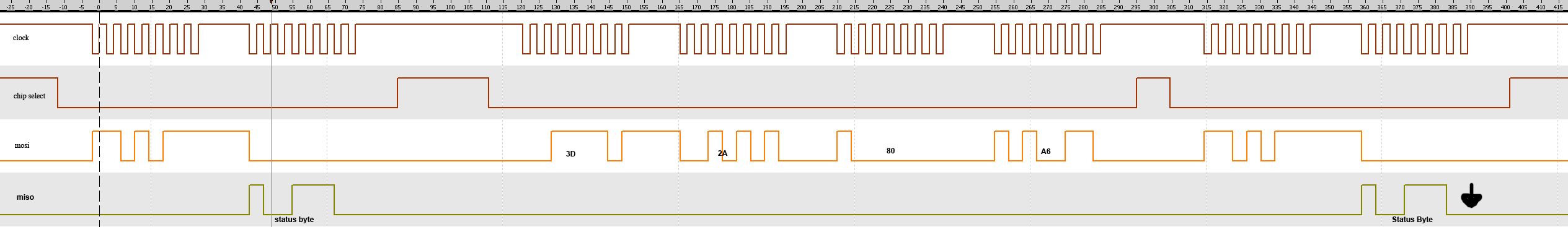 Habe mal noch einen SPI-Mitschrieb angehängt! Wenn ich genau das 2x hintereinander ausführe ... die Schaltung abschalte...dürfte bei beiden Status-Bytes das letzte Bit nicht mehr 0 sein ! Gruß, Nikias