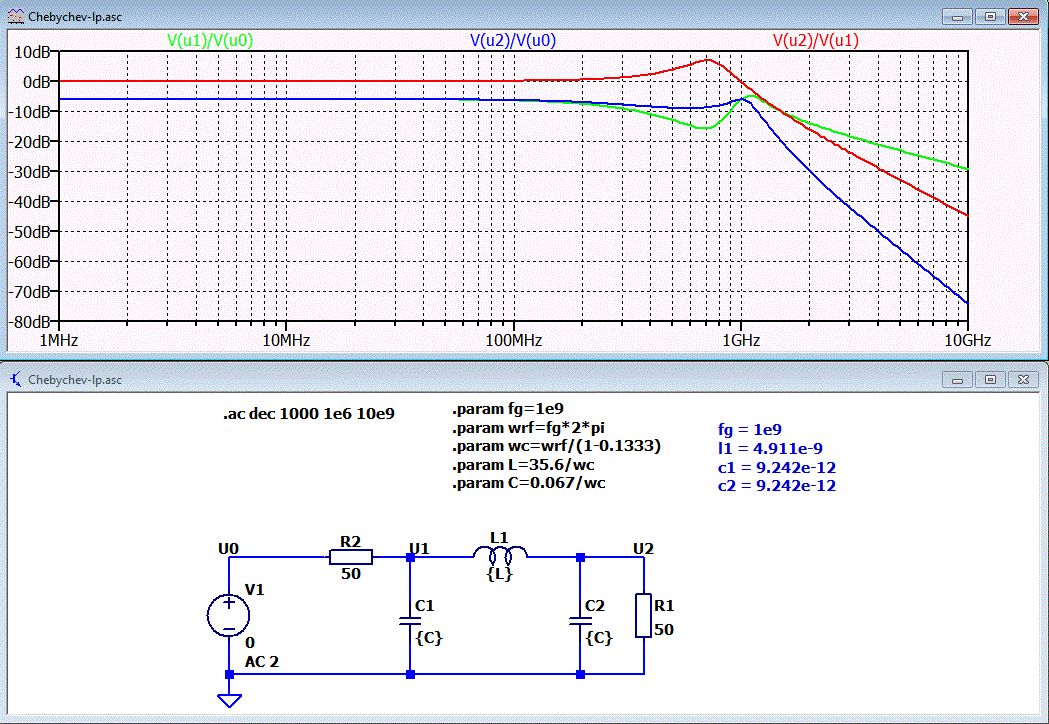 Formel berechnet von Sapwin3 U2/U1 = R2 / ( R1+R2 +(C1*R1*R2+C2*R1*R2+L1)*s +(C1*L1*R1+C2*L1*R2)*s^2 + (C2*C1*L1*R1*R2)*s^3 ) Ersetze s durch j*w.