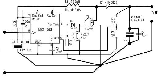 Wenn der MC34063 mit 500kHz taktet, bricht auch die Ausgangsspannung zusammen, dann ist die Ausgangsleistung verringert. Kann ja auch nicht richtig funktionieren weil die Bauteile dafür nicht ausgelegt sind. Ich wollte mit dem Einfügen von D2 + T2 nur die Flankensteilheit der FET-Ansteuerung erhöhen weil der etwas warm wurde.