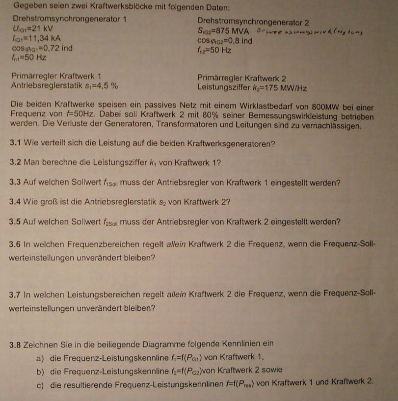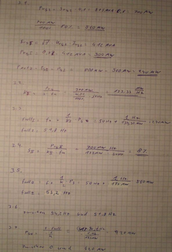 zu 3.1) Da ist doch die eigentliche Frage nicht beantwortet, oder? Wie sieht die Verteilung der Leistung auf beide Kraftwerksgeneratoren aus? Wieso bilden wir die Differenz aus Pnetz und PvS2 wenn wir doch auch PvS1=300MW haben? 3.2), 3.3) und 3.5) sollte passen? zu 3.4) bin ich mir unsicher ob ich 700MW einsetzen muss oder 80% davon? zu 3.6) ich habe die Formel, aber wie bekomme ich daraus den Bereich? Würde mich sehr freuen, wenn mir eine Person behilflich sein könnte, da ich an den Punkten hänge. LG Claudia
