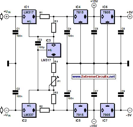 Wenn Du den Teil um IC3 wegläßt, hast Du die üblichen zwei Konstantstromquellen mit dem LM317 bzw. LM337. Der Strom ist jeweils 1,25V / R1 bzw. 1,25V / R2. Die folgenden Spannungsregler können dann maximal den durch die KSQ bereitgestellten Strom liefern, bevor deren Eingangsspannung runtergeht. Dabei ist es egal, ob als Spannungsregler 78xx/79xx oder LM317/LM337 verwendet werden, bei letzteren läßt sich die Spannung noch abgleichen / einstellen. Leider wird an R1 und R2 relativ viel Leistung umgesetzt, da 1,25V daran abfallen. Um das zu vermindern wird der Querzweig mit IC3 eingefügt. Der bildet auch eine Konstantstromquelle, welche IC1 und IC2 über R3 und R5 eine Vorspannung auf den Reglereingang gibt. Gleichzeitig läßt sich dadurch mit einem Poti P1 die Strombegrenzung für beide Zweige linear einstellen, bzw. umschalten. Wöllte man das über R1 / R2 machen, bräuchte man für 100..500mA ein Stereopoti mit 10ohm 5W (500mA muss es abkönnen) und der Verlauf wäre wegen 1,25 / R extrem nichtlinear. Ich hab damit eine symetrische Spannungsquelle gebaut, die aus den ungeregelten +/-15V eines Schaltnetzteiles +/-12V mit umschaltbarer Strombegrenzung 100mA/500mA macht. Funktioniert super. Nachteil, die Schaltung geht recht verschwenderisch mit der Eingangsspannung um. Diese sollte schon sicher 3V über der Ausgangsspannung liegen.