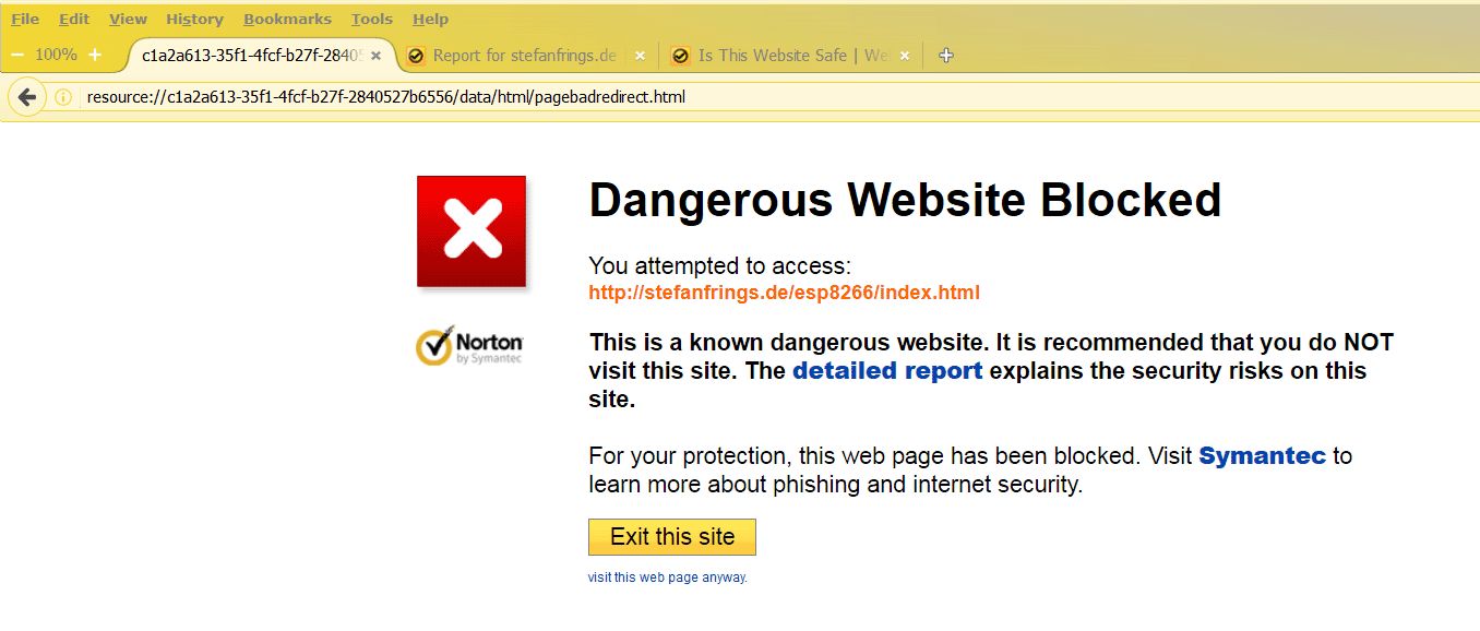 Stefan U. schrieb: > http://stefanfrings.de/esp8266/index.html Ich bekomm beim Aufruf deiner Webseite von Norten obige Warnung ???