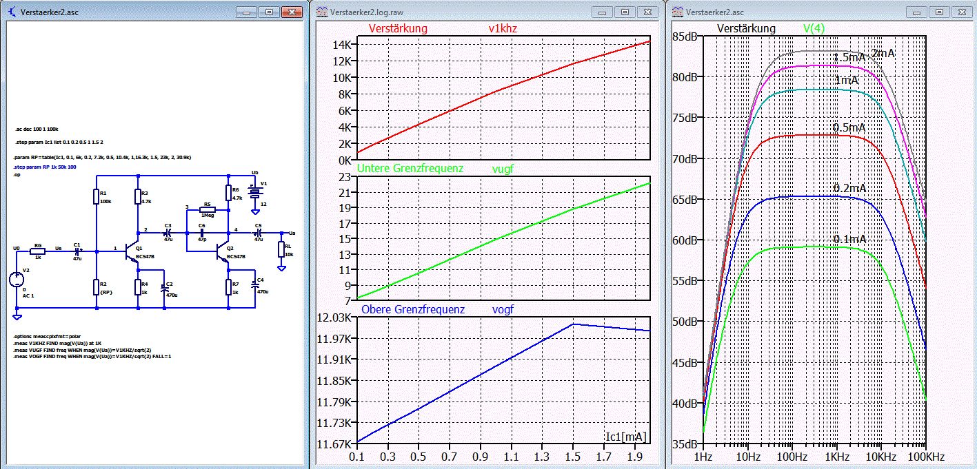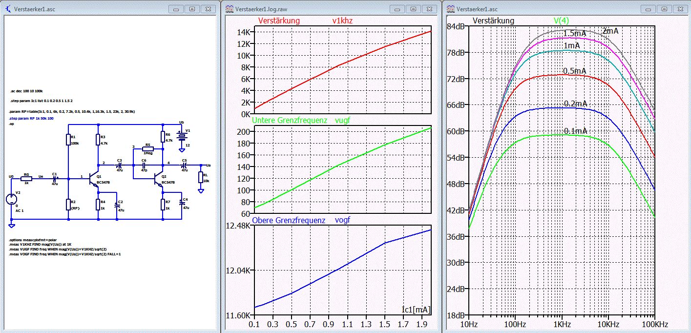 Im Anhang mal die Abhängigkeit der Verstärkung und der Grenzfrequenzen in Abghängigkeit des Kollektorstromes von T1. Der Kollektorstrom wird mit dem Poti eingestellt. Damit stellt man auch die Verstärkung ein. Die untere Grenzfrequenz ändert sich um Faktor 3 je nach Potistellung während die obere Grenzfrequenz praktisch konstant bei 12kHz bleibt. Die Schaltung habe ich mit LTspiceXVII simuliert. http://ltspice.linear-tech.com/software/LTspiceXVII.exe
