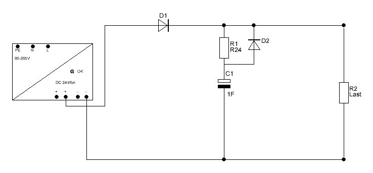 Was kostet denn so ein Kondensator und welche Lebensdauer hat der? Nur so als Hinweis: Ich kenne aus der Industrie minimalistische Systeme um kurze Stromschwankungen zu überbrücken. Die sind ganz primitiv mit 2 12V Blei-Gel Akkus in Serie und ein paar Dioden aufgebaut. 2 Akkus bekommst du um ca. 40.- Die Spannung des Netzteils wird auf 26-27V erhöht, nach den Akkus sitzen Dioden um die Spannung wieder reduzieren. Eine Strombegrenzung vor den Akkus und ein Relais oder Mosfet nach den Akkus um nach einer gewissen Zeit oder Spannung abzuschalten sollte reichen.