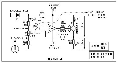 Hallo again Ich habe das Messinstrument genau unter die Lupe genommen: Kreuzspulenmeßwerk das folgende Werte verlangt um Voll /leer correct anzuzeigen. Bei 72 Ohm mit 64 mA Leer. Vor dem Geber stehen dann noch 4,6 volt Bei 7,7 Ohm mit 91,8 mA Voll. Hier nur noch 0,7 Volt. Ich brauche also eine Stromsenke zwischen 50 und 100 mA, gesteuert von einem veränderlichen Widerstand zwischen 0 Ohm (leer) und 180 Ohm (Voll). Ich habe beim Suchen folgende Schaltung entdeckt von der ich hoffe dass man sie anpassen kann.Da ich aber in Bezug auf elektronische Schaltungen nur Basic-wissen besitze, bin Ich bei Details ratlos. Mein Tangeber hat nur zwei Anschlüsse und ist damit kein Sp.Teiler mehr. R1 kann ich nicht ändern weil sonst keine 1 Volt , die ich aber für 100 mA brauche.Auf der Low-Seite will die Tankuhr aber immer noch 60 mA.Mit den 180 Ohm muß also ein Spannungsabfall von 400mVDC erzeugt werden, was aber nicht geht.Also ein digitales Poti wäre ideal, es reichen mir 20 Steps zwischen leer und voll.Ich hab aber keine Ahnung wie man die digi Potis analog ansteuern könnte. Ich erwarte keine fertigen Lösungen, aber nach über 40 stunden Googeln in Fachartikeln komme ich ohne fachmänische Hilfe hier nicht weiter. für jeden Hinweis dankbar