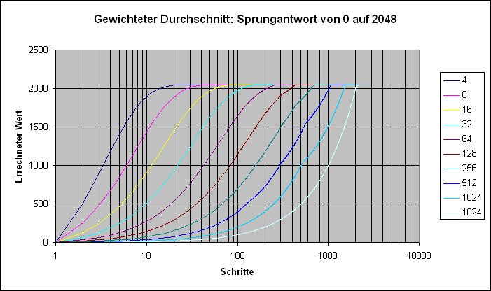 Hallo den Nachteil des "nachhinkens" kann man umgehen wenn man zu Anfang den Mittelwert über die wirklich schon gemessenen Werte berechnet. Wie ich schon geschrieben habe: 1 Wert=1Mittelwert. Bei der 2ten Messung Mittelwert = alter Mittelwert/2 + neuer Wert/2 Bei der 3ten Messung Mittelwert = alter Mittelwert/3*2 + neuer Wert/3 bei der nten Messung Mittelwert = alter Mittelwert/n*(n-1)+neuer Wert/n mit n=Anzahl der Messung wobei n mitläuft bis die Blockgröße erreicht ist. z.B. 32 oder 64 evtl. kann man auch statt der exakten Anzahlen Stufen in 2er Potenzen verwenden. Diese Routine läuft seit Jahren in Messsystemen auf PCs bei vielen Kunden von mir.