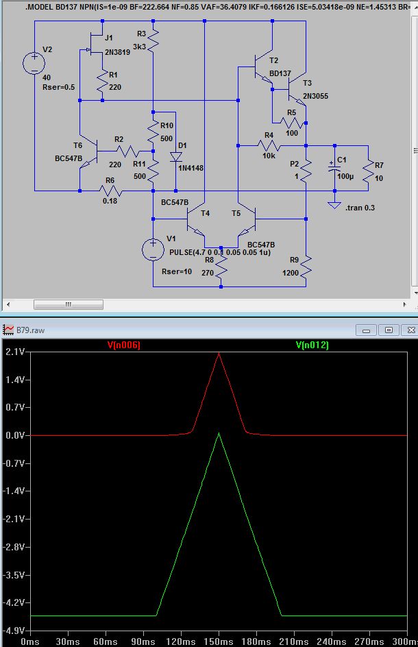 Michael B. schrieb: > Tim M. schrieb: >> Werde jetzt einmal alle 'falschen' Bauteile wieder durch die >> ursprünglichen ersetzen und das Ganze einmal testen... > > Na ja, möglichst erst NACHDEM man sich überlegt hat was die Schaltung > aushält, sonst löst sie sich wieder in Rauch auf. > > Ein 2N3819/E300 hält jedenfalls nur 25V aus. Besser wohl ein 2N4341. Man könnte die KSQ nach bekannter Art auch auf NPN BJT umändern um den FET Beschaffungsproblemen aus dem Weg zu gehen. > > Ein 2N3055 zwar 40V/3A, aber nur wenn er auf Eis schwimmt. > Bei einem 1K/W Kühlkörper sind es nur noch 60W. > > Und R9 ist 1k2, das erlaubt ein Aufdrehen der Spannung bis 40V, besser > wäre der Poti-Bereich genutzt wenn R9 nur 1k5 wäre (31V, Toleranz der > 4V7 kann es unter 30V drücken, besser gleich eine LM336-5.0 an Stelle > der 4V7 einsetzen). Was mir an der Position vom Stromeinstellungspoti nicht gefällt, ist, daß bei einem Ausfall, Drahtbruch, wackelnden Schleifer die Spannung sofort auf Maximum hochschnellt. Wenn das Poti im negativen Zweig wäre, würde die Spannung auf minimum hinunter sinken. Ich werde immer nervös wenn ich solche Spannungseinstellkonfigurationen sehe. > > R3 wird mit 0.55W ziemlich belastet, besser ein 1W Widerstand. Vielleicht ist es Overkill das folgende noch zu machen: Zur Verbesserung des Temperaturgangs könnte man die Differenzstufe mit zusammengeklebten Plastik Transistoren umbauen. Das würde die thermische Stabilität verbessern. Auch ein Metallring würde thermisch die Sache noch verbessern. R9 sollte ein Metalfilm Widerstand sein.