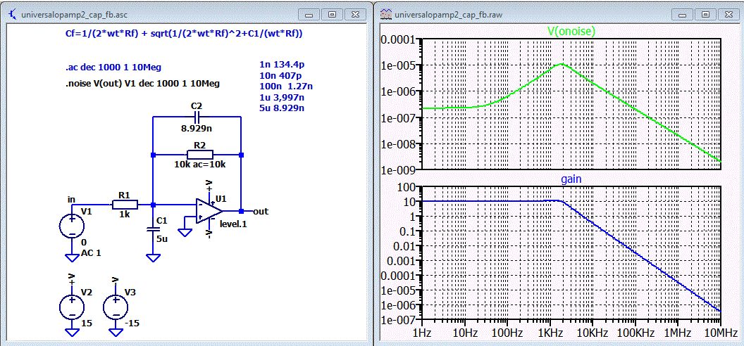 Die Rauschverstärkung für das Rauschen des Opamps ist |(Z1_+Z2_)/Z1_|. Das ist also so als ob man die Rauschspannung an den Pluseingang anlegt. .asc Schaltplan .plt Plot Settings Beide Dateien in ein Verzeichnis packen und dann die .asc Datei mit LTspiceXVII öffnen und die Simulation starten. http://ltspice.linear-tech.com/software/LTspiceXVII.exe Normalerweise hat man natürlich keine 5uF an dem Minuseingang. Den Wert habe ich nur gewählt, damit man auf den Verauf in deinem 1. Bild kommt.