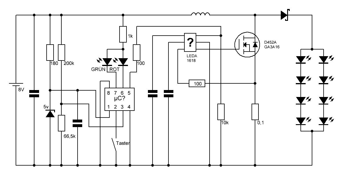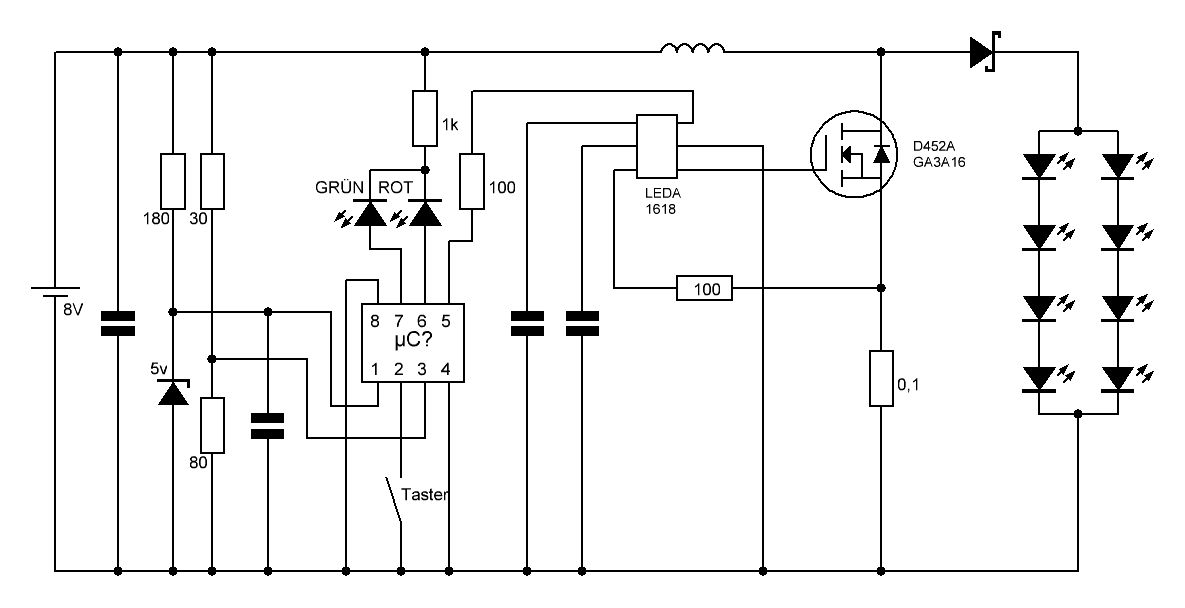 Hallo liebe Gemeinde, ich würde gerne meine (Fahrrad-)LED-Lampe pimpen, da mir die Funktionen so wie sie sind nicht ganz passen. 1. Lässt sie sich seit einiger Zeit nicht mehr ganz ausschalten, sondern einige LEDs leuchten leicht (siehe Bild). Das Muster ändert sich immer wieder. 2. Über den Taster schaltet man folgende Modi: Voll -> Halb -> Stroboskop -> Aus. Äußerst unpraktisch wenn man Nachts durch den Wald düst und bei Gegenverkehr (Jogger) schnell ausschalten will um diese nicht zu blenden (zweite Lampe als Abblendlicht läuft immer mit). 3. Den Taster hätte ich gerne nahe am Griff und nicht an der Lampe. Die passende Funktion über einen µC hinzukriegen wäre für mich kein Problem. Fragen wirft jedoch die Versorgung der Power-LEDs selbst auf. Ich habe versucht die Schaltung durch Nachverfolgen der Leiterbahnen zu rekonstruieren und das Resultat angehängt. Es scheint eine Kombination aus Chopper und Boost-Converter beteiligt zu sein. Das IC welches offensichtlich der Mikrocontroller ist, trägt keine Bezeichnung. Das für die LEDs (bzw. den MOSFET) zuständige IC hat die Bezeichnung LEDA 1618, wozu ich allerdings nichts finden kann. Laut OSZI versucht es wohl eine Konstantstromsteuerung per 160KHz PWM. Der µC steuert über ein Rechtecksignal auf Pin 5 die an/aus-Phasen und damit die Helligkeit bzw. die Stroboskopfunktion. Kennt vielleicht jemand diesen Chip bzw. etwas entsprechendes womit ich eine neue Schaltung ähnlicher Art (mit einem µC meiner Wahl) neu aufbauen kann?