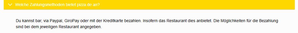 Zitat von der Seite Pizza.de: Einfach passendes Gericht auswählen und direkt online bestellen. Bezahlt werden Thai, Pasta und Gyros easy online mit PayPal, VISA oder Sofortüberweisung oder wie gewohnt bei Lieferung.