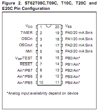 Wie genauer als ST6208C hättest du es denn gerne? Mit Herstellerwoche und Vorname der Tochter des Chipdesigners? ;-) Aber das war einfach nur der ersten ST6 Kandidat mit 20 Pins, den ich fand. Und jeder Pin passte. Aber schon das Datasheet dazu hat 4 Typen und enthält Verweise auf diverse andere dieser Baureihe, wie ST6Pxxx und ST6Txxx. Ausserdem könnte es in der ST6 Reihe noch weitere Typen geben, die dieses Pinout verwenden. Das lässt sich nicht erraten. Es ist nur ziemlich unwahrscheinlich, dass ein anderer Hersteller dazu passt.