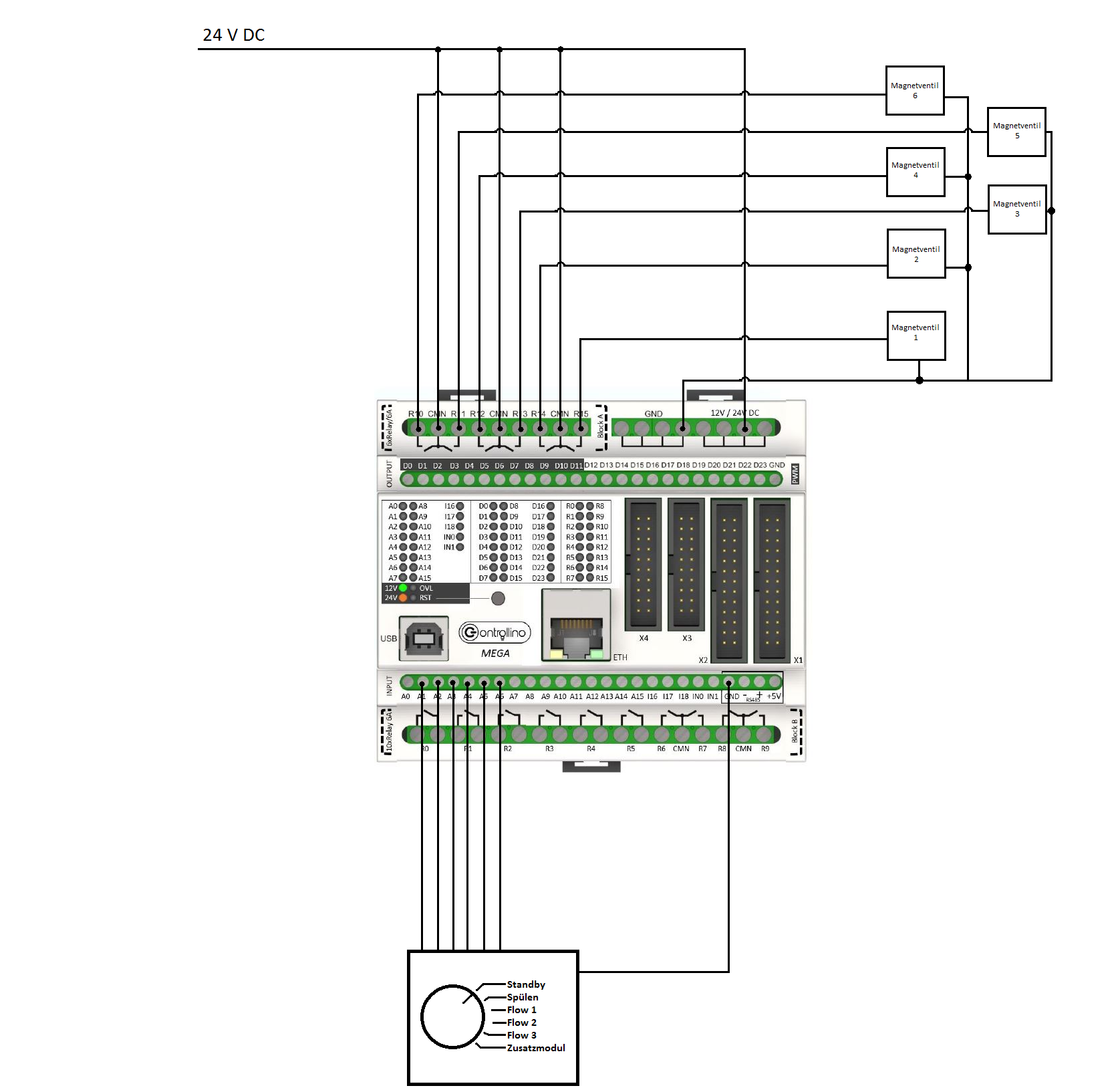 Hallo liebes µC-Forum, bevor jetzt wieder die typischen Vorwürfe kommen. Ja ich weiß, dass Transistoren besser wären und es eine kostengünstigere Alternative gibt. Ich bin halt an die Hardware gebunden und will mir, was nur rechtens ist, Tipps und Beratung holen. Controllino: Ein programmierbares Steuerungssystem auf der Arduinobasis mit einer EN Zulassung Daten: Microcontroller: ATmega2560 16 Relaisausgänge Taktrate: 16 Mhz Ethernet Connector 2x RS232 Interface 1x RS485 Interface 1x SPI Interface 1x I2C Interface Hutschienenmontage: EN50022, 35mm Lagertemperatur: -20 °C - +70 °C. Analoge Auflösung 10 Bit Anzahl Eingänge max. 21 Anzahl I/O 21 Anzahl Relais Ausgänge max. 16 Anzahl Transistor Ausgänge max. 24 Anzahl analoge Eingänge max. 16 Anzahl digitale Eingänge max. 21 Betriebsspannung 12 V/DC 24 V/DC Echtzeituhr Ja Farbe Weiß/Schwarz Herst.-Teilenr. 100-200-00 Kategorie SPS-Steuerungsmodul Max. Umgebungstemperatur 55 °C Min. Umgebungstemperatur 0 °C PWM-Ausgänge 15 Prozessor ATmega2560 Schnittstellen I²C RS-232 RS-232 RS-485 SPI USB 2.0 Buchse B Ethernet Stromaufnahme max. 40 A Magnetventile: Daten: Bauart: 2/2 Wege KV-Wert: 10,2 m³/h Schaltfunktion: NC - stromlos geschlossen Steuerung: zwangsgesteuert Material: Edelstahl 1.4308 Dichtung: EPDM Spannung: 24V DC Spannungstoleranz: +/- 10% nach VDE 0580 Leistungsaufnahme: 20 Watt Einschaltdauer: 100% ED Schutzart: IP65 mit montierter Gerätesteckdose Medium: flüssig & gasförmige Medien Temperatur Medium: -10°C bis +130°C Temperatur Umgebung: max. + 50°C Maximaler Druck: 0,0 - 8 bar Dabei sollen 6 Magnetventile, je nach gewünschten Zustand, geöffnet werden. Dies auch am besten etwas Zeitversetzt. Zustand V 1 V 2 V 3 V 4 V 5 V 6 Standby X X X X X X 1 O O O O O O 2 O O X X X X 3 X X O O X X 4 X X X X O O 5 X O X X X X X = geschlossen O = geöffnet Einen ersten Gedanken zur Schaltung (ganz grob) befindet sich im Anhang. Und ja ich weiß...ist mit keinem ernst zunehmenden Programm erstellt worden... Ich selbst habe nicht viel Erfahrung mit µC. Zwar habe ich selber einen Arduino Mega, nur kam ich bisher nicht dazu etwas größere Projekte zu realiesen (Kind, Studium und Hausausbau). Soll keine Rechtfertigung sondern nur eine reine Bestandsaufnahme. Da jetzt bald mehr Zeit vorhanden ist, werde ich dies sowieso ändern. Bei diesem Projekt sehe ich die Chance für den ersten großen Schritt in Richtung µC. Bisher habe ich auch nicht großartig mit dem Arduino programmiert gehabt. Ich wäre dankbar für Vorschläge, Ideen und Anregungen zum Programmiercode, Schaltung und Hinweisen bezüglich Literatur oder Codebeispielen. Parallel zu diesem Forum, bin ich selber dabei Quellen zu suchen und durchsuchen.