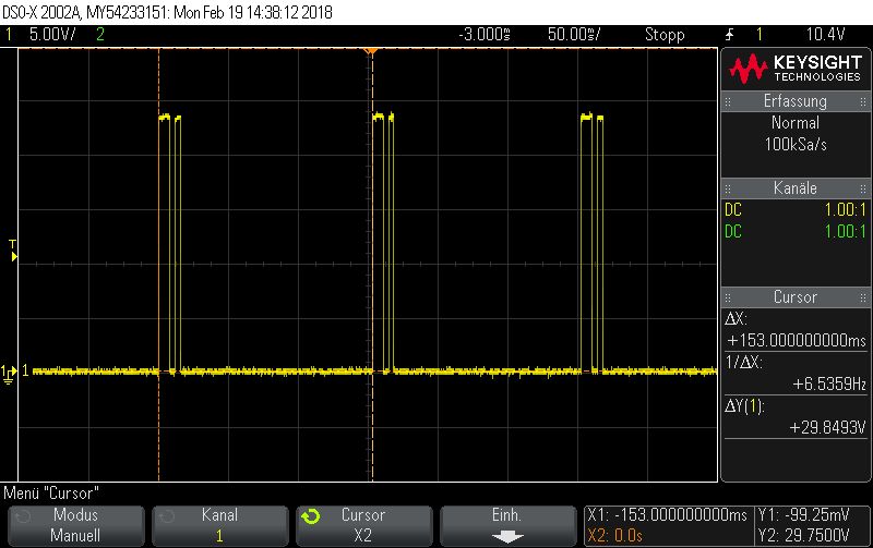 Hallo Zusammen, leider habe ich das Problem das der Sensor doppelt zählt. Die Ursache ist der 2te Impuls, der aufgrund des Aufbau des Sensors zustande kommt. Da die Impulse weit genug auseinander liegen wollte ich die 4 mS zwischen den Pulsen mit einem Kondensator brücken. Leider fehlt mir der Ansatzpunkt, da ich es bereits mit einer RC Kombination (10kOhm zu 200nF) getestet habe. Ich freue mich über jede Hilfe. Mit freundlichen Grüßen TR