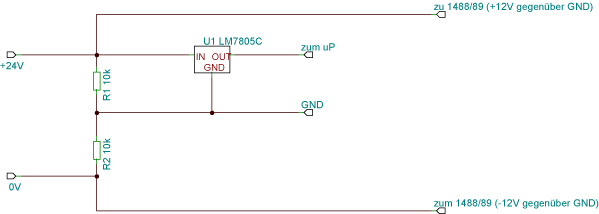 tag, aha. also muss ich das mit Z-Dioden oder mit nem OP machen, wenn ich +12 und -12 V haben will. ich frage mich gerade, ob es überhaupt sinnvoll ist, eine so aufwändige schaltung zu machen, nur damit ich -12 V habe, sodass ich den MC1488 betreiben kann. ginge es nicht auch einfacher, einen uP über RS232 mit dem PC zu verbinden? immer davon ausgehend, dass ich keine MAX232 zur hand habe. und extra wegen einem IC eine bestellung zu machen lohnt sich ja wohl kaum oder?? ;) grüsse