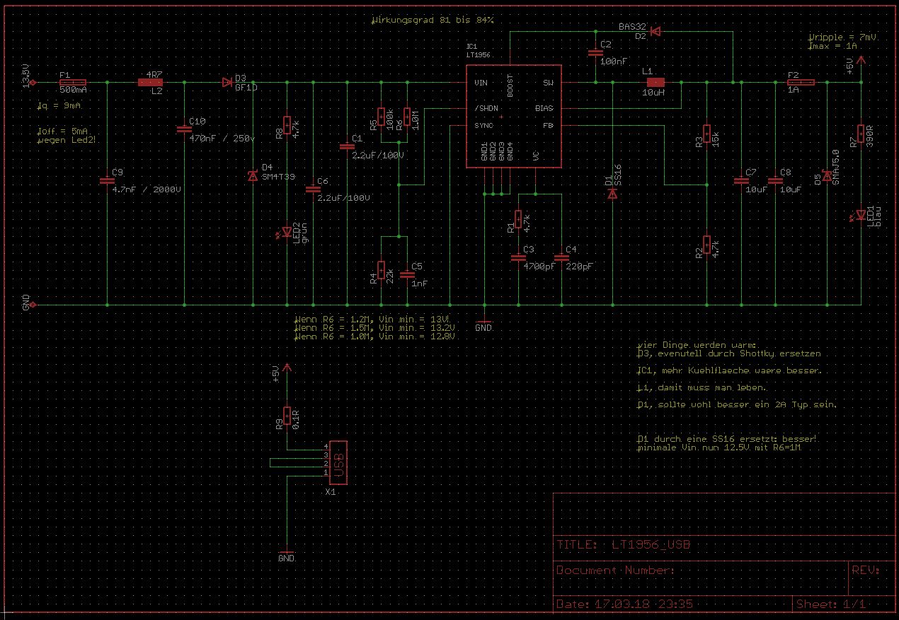 Ich brauchte jetzt doch tatsaechlich selber mal so einen Adapter um mein Handy als Navi am Motorrad nutzen zu koennen. Deshalb hab ich gestern schnell aus Resten sowas zusammengeloetet. Das Bild zeigt wie man so etwas bauen koennte. Es gibt sowohl am Eingang wie auch am Ausgang Schutz gegen Ueberstroeme und Ueberspannungen. Das die Schaltung einen 2 oder 4kV Surge uebersteht glaube ich nicht weil das Layout etwas eng ist, aber fuer alles was ich im Bordnetz erwarte muesste es ausreichen. Man koennte die Platinengroesse sicherlich noch halbieren da ich die Bauteile nur auf einer Seite habe. Auf veroeffentlichung von Schaltung und Layout verzichte ich mal da dies eh keiner Nachbauen kann weil er die Teile so nicht hat. Ich bin im Prinzip einfach vom Datenblatt ausgegangen und hab dann alles anhand meiner Vorraete abgeaendert. :-) Den LT1956 gibt es aber immerhin bei Reichelt und im Datenblatt gibt es auch einen Layoutvorschlag dem ich weitestgehend gefolgt bin. Ueberhaubt ist es ein gutes Datenblatt das einen etwas ueber den Preis des Bausteins hinwegtroestet... Eine kleine Besonderheit noch. Die Schaltung geht erst bei 12.6V in Betrieb. (ueber Widerstand einstellbar). Damit koennte man dafuer sorgen das sie erst arbeitet wenn der Motor an geht. (brauche ich nicht) Oder falls man aus irgenwelchen Gruenden vergisst sie abzuschalten wird die Batterie nicht tiefentladen. Im letzteren Fall sollte man aber wohl die LED am Eingang entfernen. Olaf