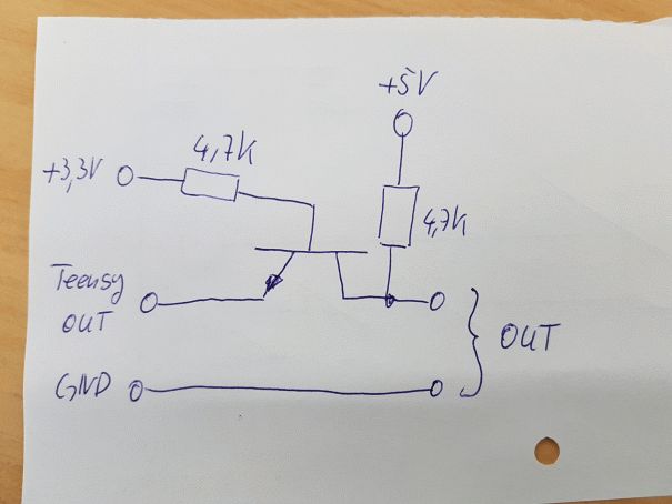 eigentlich doch am Teensy Ausgang einen 4,7k an die Basis des Transistors, Kollektor auf das Steuerkabel und Emitter auf Masse?