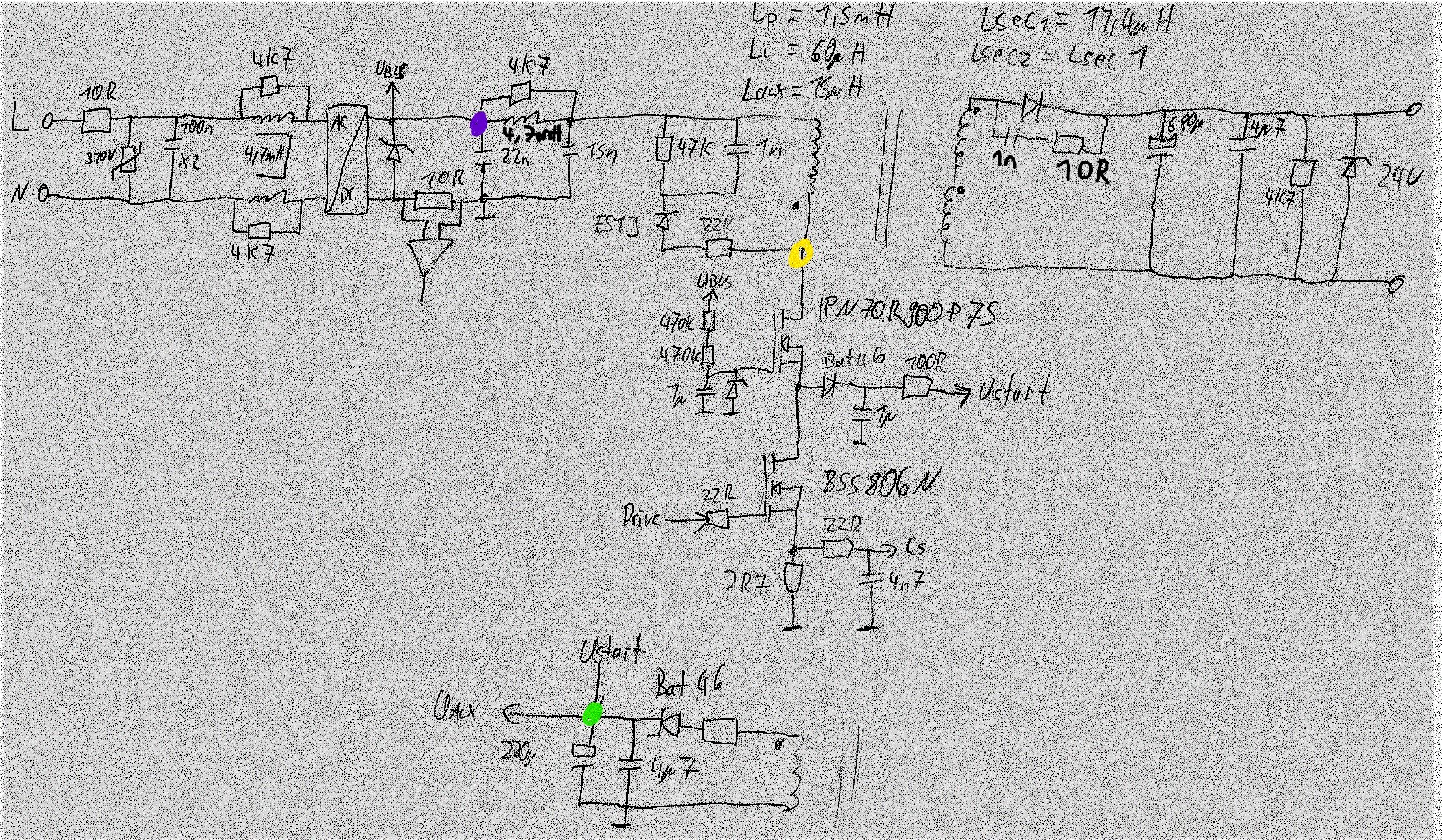 Hallo Elzaar, 1.: Mach halt den Kondensator vor dem Übertrager (15nF) so groß, daß die "gefährliche" Spannung im Leerlauf nicht unterschritten wird. 2.: Gib dem IPD70R900 einen Gate-Vorwiderstand ~20 Ohm, direkt am Transistor.
