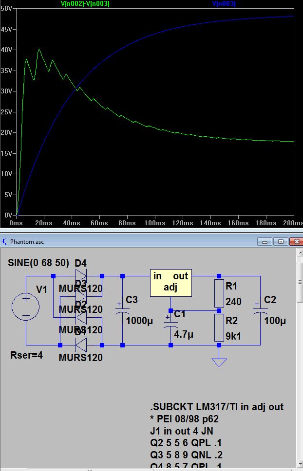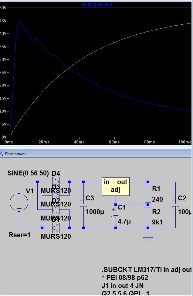 der schreckliche Sven schrieb: > So ein Krampf. > Für das Zeiterleben eines LM317 steigt beim Einschalten die > Eingangsspannung recht langsam. Und er hat 1,5 Ampere zur Verfügung, den > Ausgangselko aufzuladen. Bis die Ausgangsspannung 48 Volt erreicht, > fallen am LM317 ca. 3 Volt ab. Blödsinn, wie man am Simulationsdiagramm der blauen Linie sieht. Axel S. schrieb: > Der Eingangskondensator ist mit 1000µF zehnmal so groß. So > lange der Trafo, der die 48V AC liefert, nicht wenigstens 15A Ladestrom > hergibt, wird die Eingangsspannung des LM317 nicht schneller ansteigen > als die Ausgangsspannung. Denn der LM317 kann 1.5A in die 100µF am > Ausgang schieben. Damit an 1000µF die Spannung genauso schnell steigt, > braucht es 15A. Nun, 1 Ohm Innenwiderstand müsste der Trafo haben, damit die Spannungdifferenz über 40V geht, bei 2 Ohm bleibt er drunter.