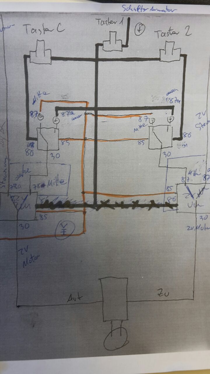 Servus, sorry falls ich hier was poste was nich hier hin gehört, oder schonmal behandelt wurde, aber ich versteh nur bahnhof wenn ich hier was lese.. :p ich habe ein problem, vielleicht kann mir ja wer helfen: ich möchte die steuerung meiner Zentralverriegelung an der Heckklappe ändern. da ich oft am See bin, möchte ich die ZV für die Heckklappe gerne NUR in diesem fall manuell ansteuern können. dazu müsste ich beide leitungen zum ZV motor mit einem wechselrelais versehen, was im normalfall beim drücken auf die FFB das relais mit strom versorgt, die leitung schließt und den stromimpuls für auf/zu durchlässt. wenn kein strom aufm relais is, liegt es als -leitung auf der manuellen steuerung. als zweites brauch ich 2 taster die jeweils einen + impuls durch die -leitung jagd damit die ZV auf und zu sperrt. also nochmal 2 relais die von hausaus auf - eingestellt sind und per taster druck zur plus leitung werden. dazu dann noch ein zusatz taster für die generelle stromversorgung des ganzen. also 3 taster, 4 relais und viele kabel/lötstellen. gibts für sowas nich eine "kleinere" lösung sowas auf ne schaltplatine zu löten? bzw löten zu lassen. ich könnts ned. oder gibts firmen/selbständige die sowas können und machen? bin hier für tips sehr dankbar, evtl. kann mir auch wer sowas machen. natürlich nicht umsonst. ne passende skizze hab ich mir schonmal gemacht, aber so ganz hauts noch nich hin. danke für eure hilfe gruß Michi