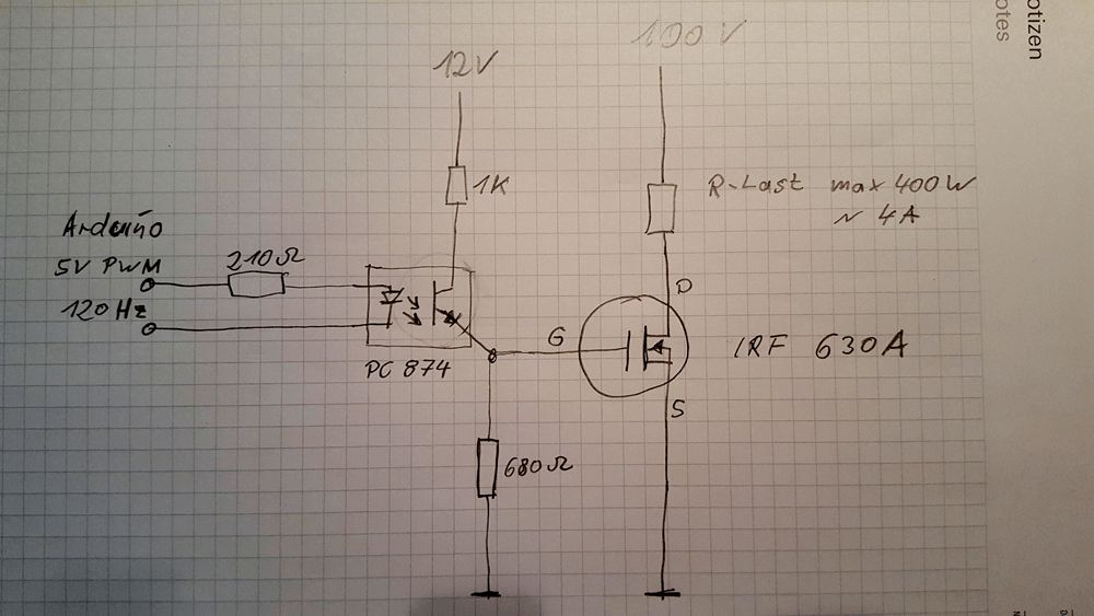 Hallo. Der Optokoppler ist wie schon geschrieben bei den 680 Ohm. Und der 1k direkt am Gate. Da der Arduino aber nicht immer in Betrieb sein muss, hab ich dann über den 1k die 12V am Gate anliegen, was genau falsch ist. Also wollte ich es so umbauen wie gezeichnet. Mit den Widerständen bin ich unsicher, weil mir absolut der fließende Strom unklar ist und nur von der Kapazität vom Gate abhängig ist!? Außerdem soll ja die Gefahr von Schwinungen bestehen? Ich hoffe ich hab mir den 120 Hz Pwm einen guten Kompromiss gefunden. Die Regelung funktioniert so weit. Ein Optokoppler wollte ich aus Sicherheitsgründen einbauen, da ich bei einem defekten Mosfet die 100V nicht im Arduino haben möchte. Die 100V kommen im übrigen von einer Solarzelle ohne Last.
